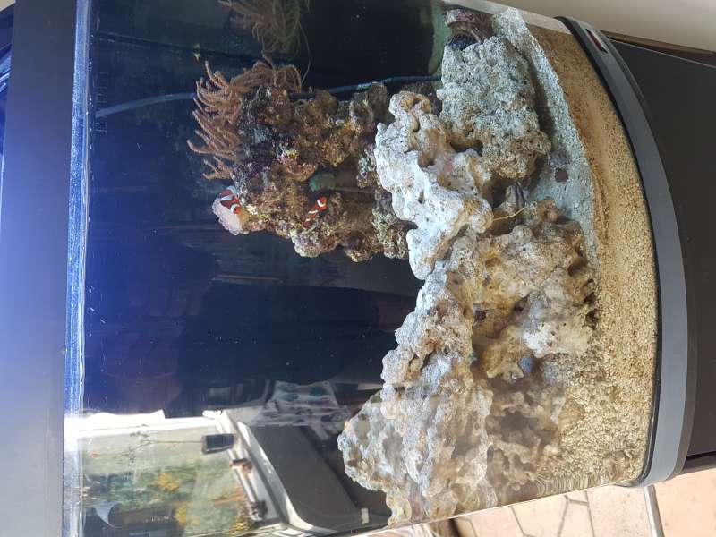 Jeg har købt et 130 l. Akvarie som i kan se på billedet. Der er 2 klovnfisk, 1 6 seksstribet fisk og et søpindsvin og nogle søstjerner.