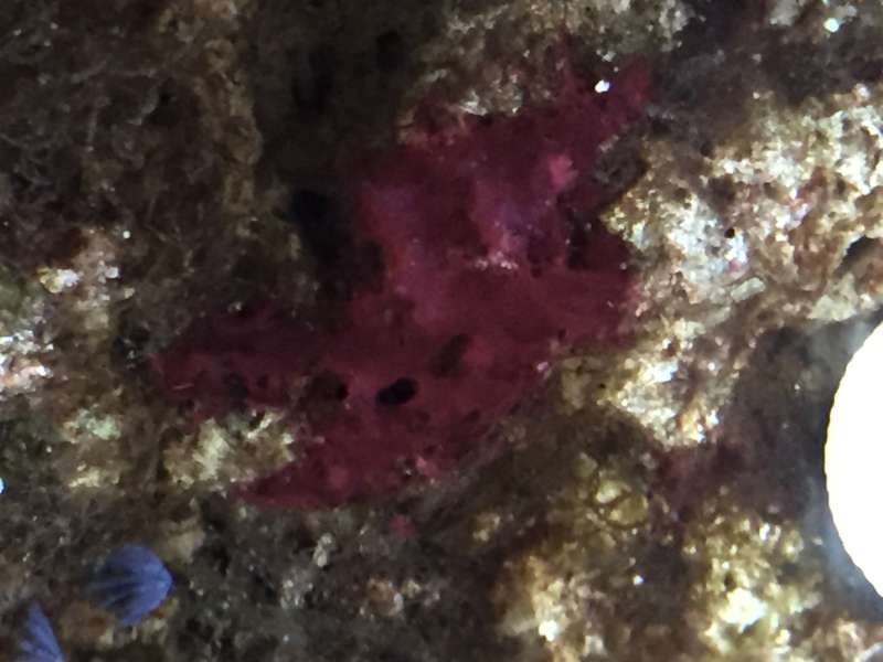 Har et lille nystartet (45 dage) saltakvarie, nu med CUC og en enkelt Hugo. Der er den seneste tid dukket nogle rød-lilka plamager op forskellige steder på LS, sandbund. Se billeder - nogen ideer om hvad det er?