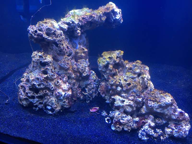 Akvariet er startet op på døde sten, som er limet til ønsket opsætning, frisk saltvand, et par rå rejer og et par LS fra mit kørende akvarie.