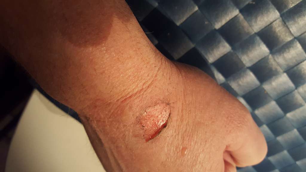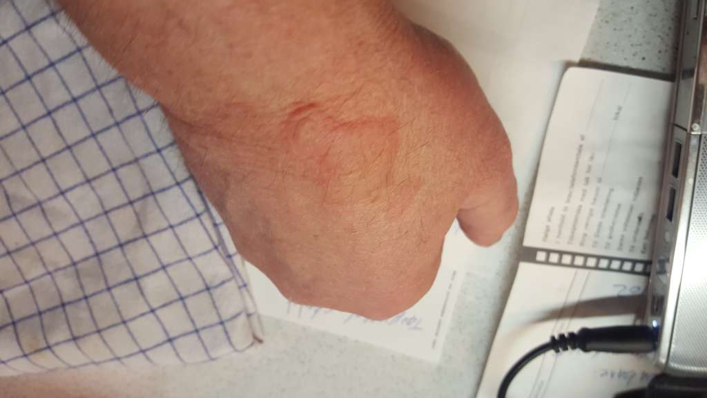 Da jeg sad og spiste morgenmad opdagede jeg, at hånden var begyndt at hæve lidt og der bredte sig en rødmen omkring såret.