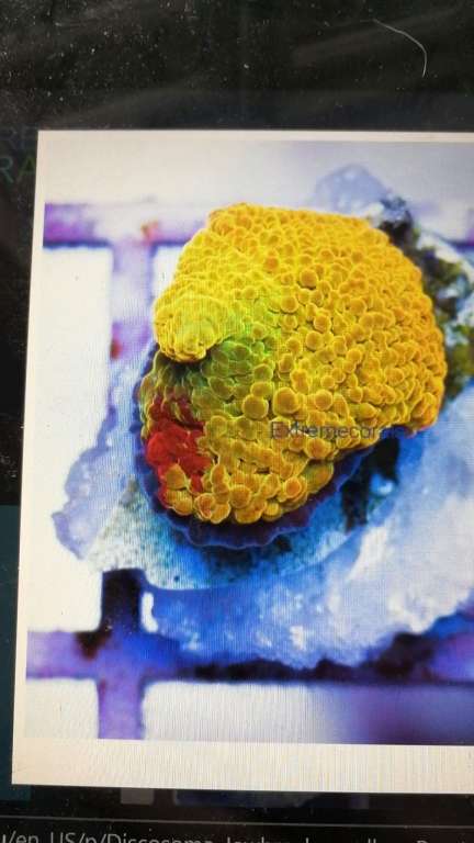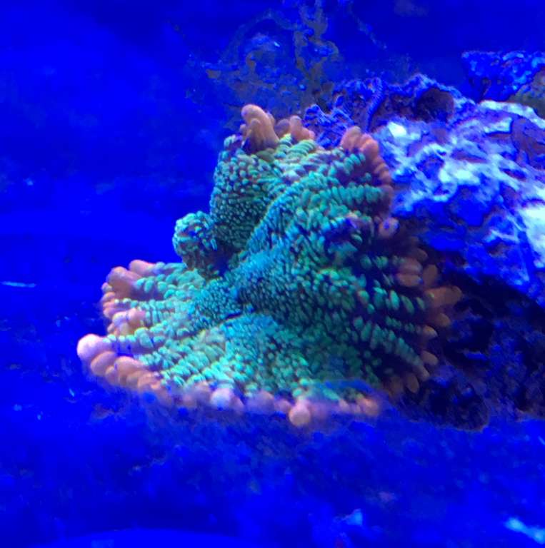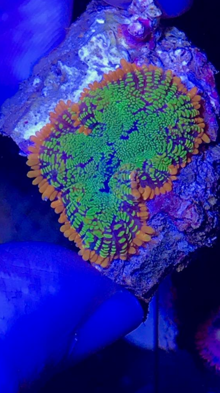 Ultra Bullseye. Blå basis, irgrønne polypper og skrigorange kant.
