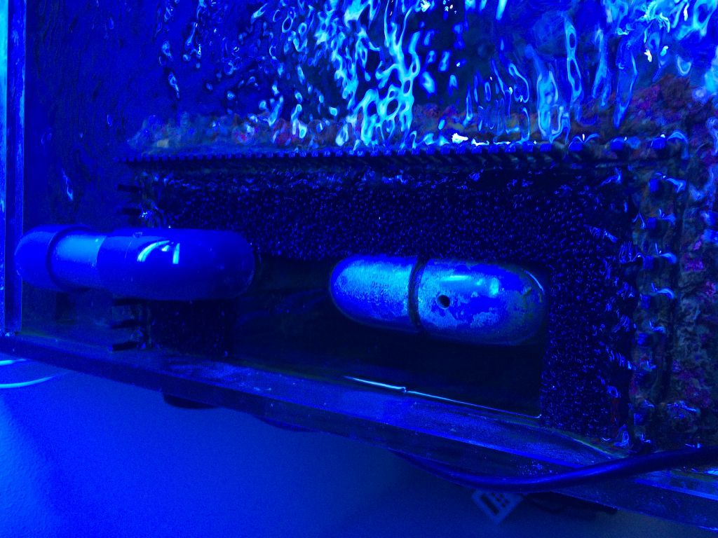 Jeg har skåret et stykke grov filtersvamp ud som et U og sat i spænd i toppen af overløbet som overløbsvandet løber ud på og risler igennem hurtigt.