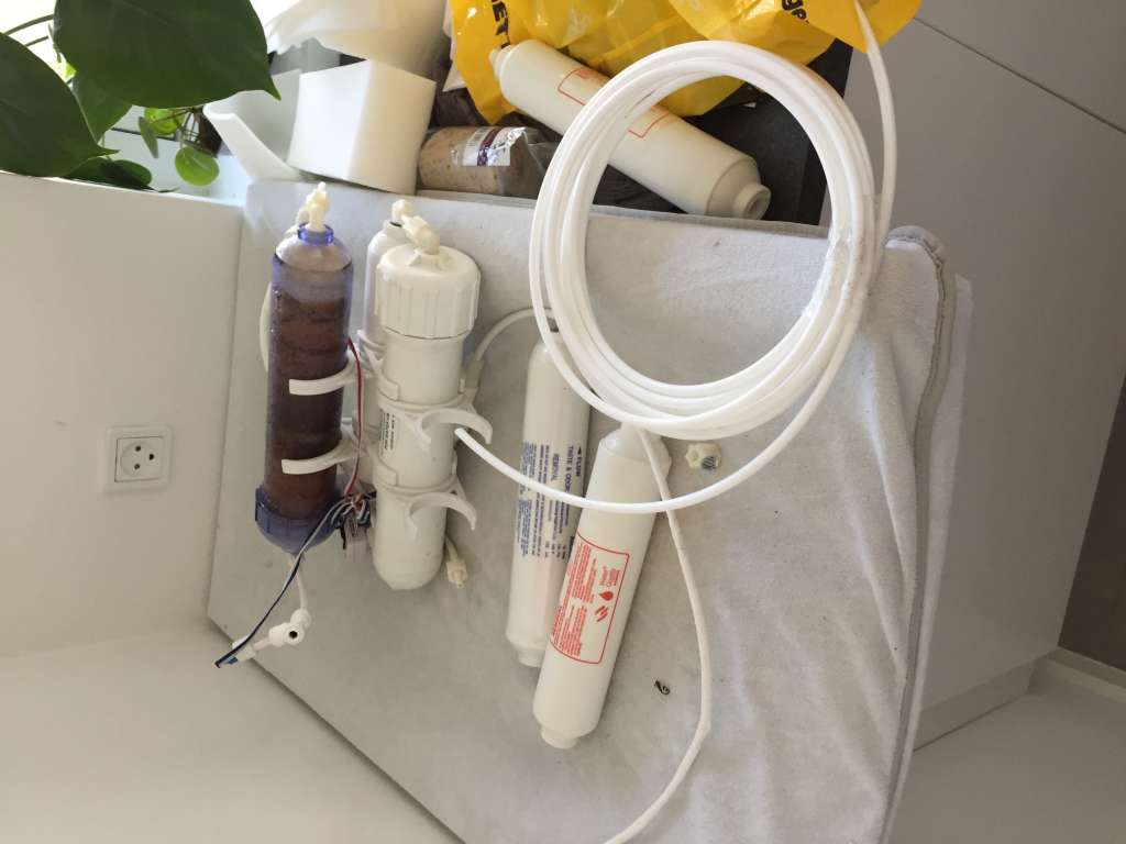 Så er vi tæt på at være igang! Forfiltre, slanger og harpiks blev skiftet på mit gamle RO anlæg. Herefter laver det vand med 3-5 TDS før harpiks og 0 TDS efter. Det er godkendt.