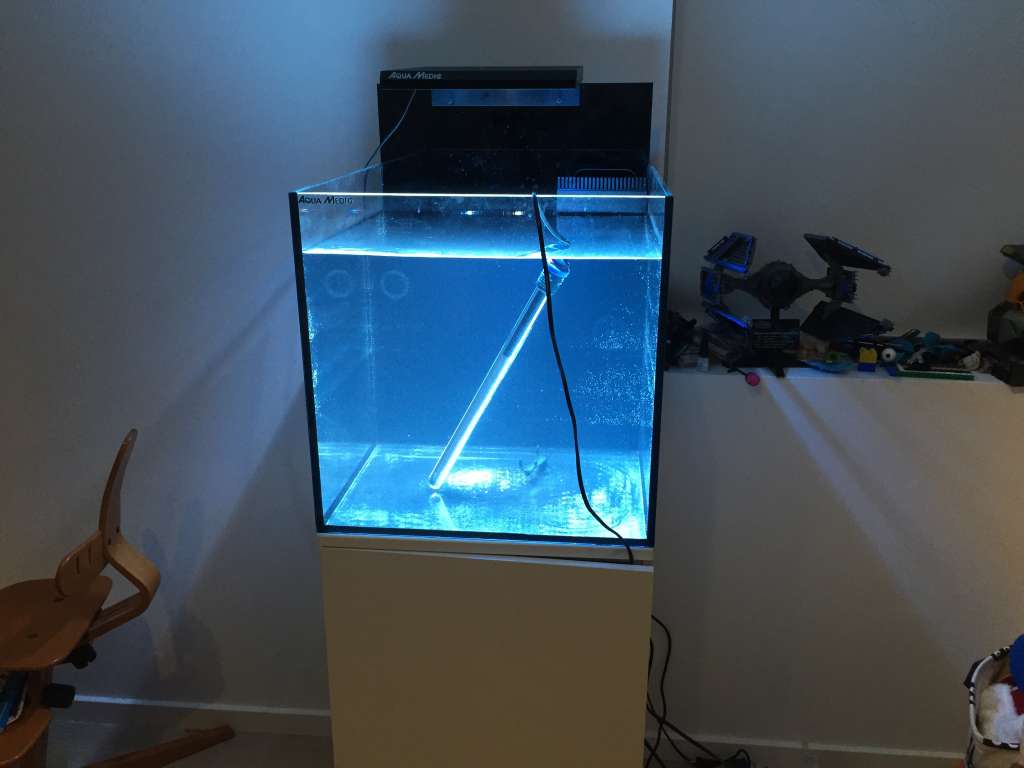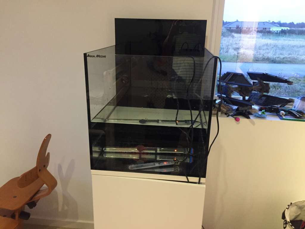 Akvariet er et Aqua medic cubicus, og kan forhåbentlig stille mine abstinenser ift. noget større, som nok må vente lidt tid endnu... desværre. Egentligt et tilfælde jeg er endt med dette akvarium, men det har en fin størrelse og passer fint ind på hans værelse. Har ellers altid haft den holdning, at akvarier under 250 liter skulle jeg aldrig eje - og da slet ikke et cube-formet!!!!