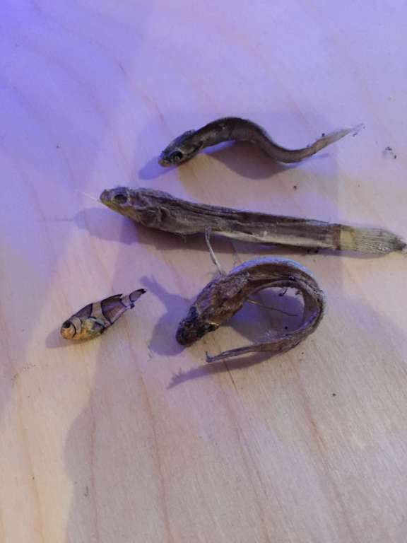 Da jeg skilte baljen fandt jeg 4 udtørrede fisk bag sumpen, op mod væggen. 1 klovn og 3 forskellige sandspisere. De er hoppet ud af overløbskammer, inden jeg fik lukket for adgang til dette med et tagrende net.