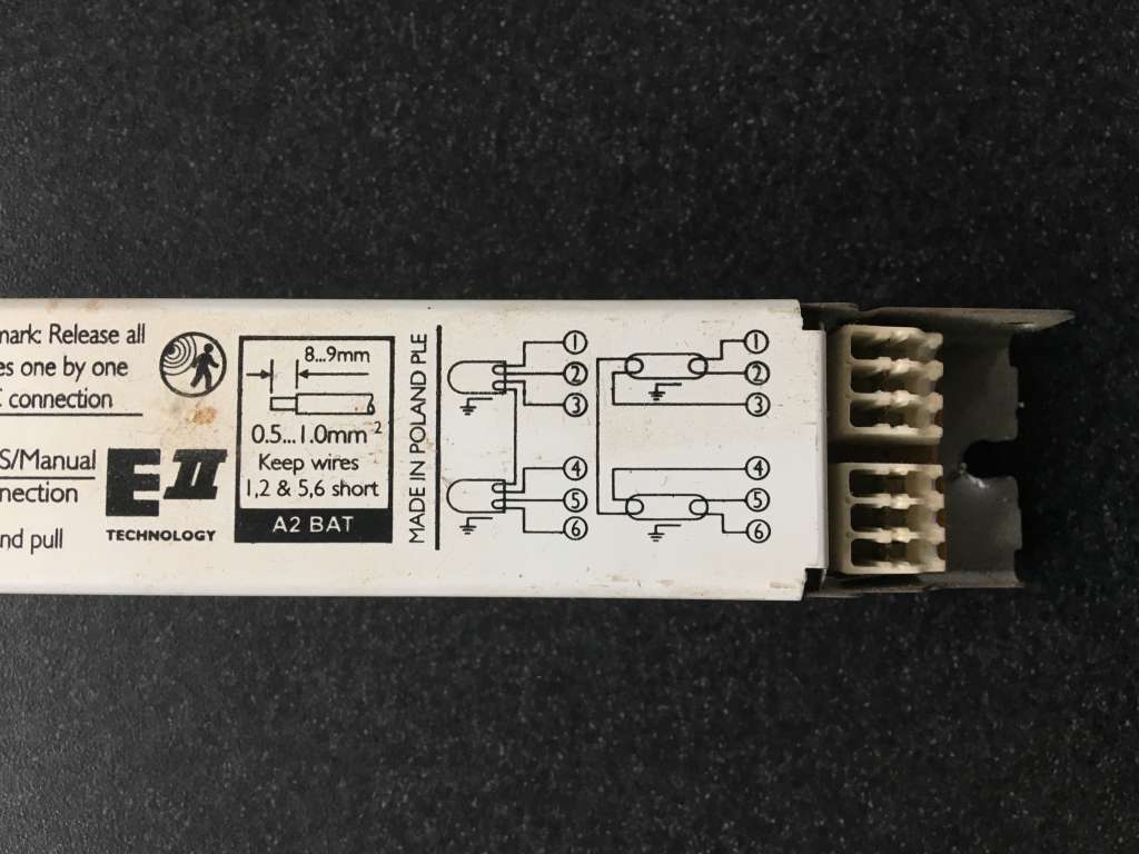 De 2 T5 rør har en glødetråd i hver ende som hver har 2 tilslutninger skal forbindes som vist yderst til højre på billede 2, til klemme 1 -6 i højre side
