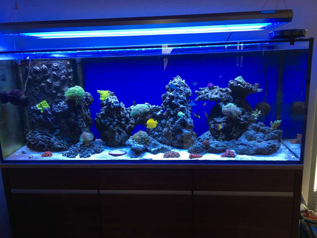 Akvariet blev startet op med knap 40 kg døde og levende sten, 20 kg Red Sea levende sand og Aqua forrest Reef salt.
