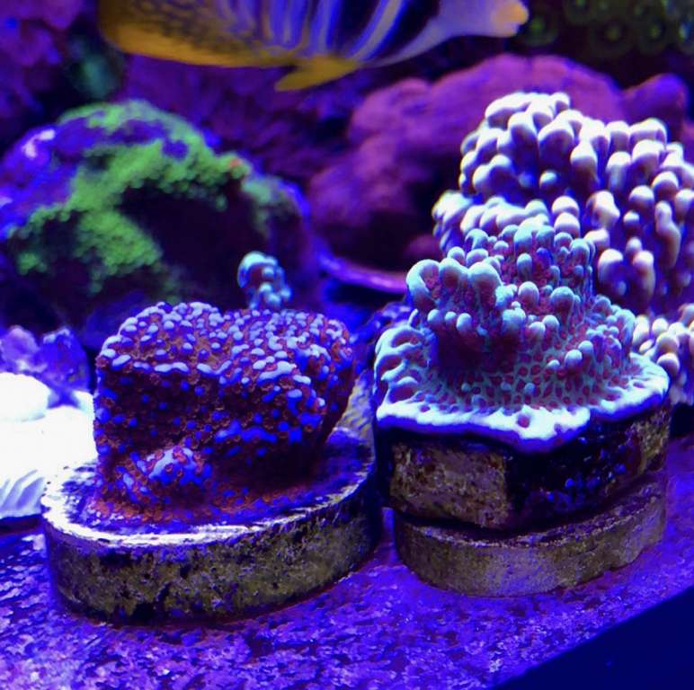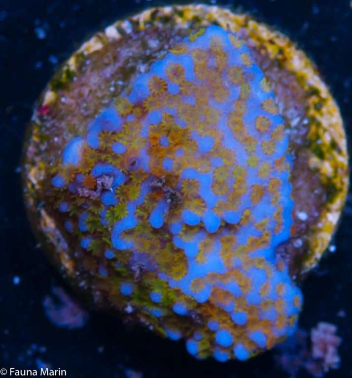 Jeg fik selv på et tidspunkt en Monti med helt gul bund og blå polypper. Jeg fik to med hjem og de blev placeret i to forskellige akvarier. Vi fik aldrig de farver frem igen, efter vi fik dem hjem. Det tror jeg skyldtes at de kom fra sådan et akvarie. Men de var hulme flotte.