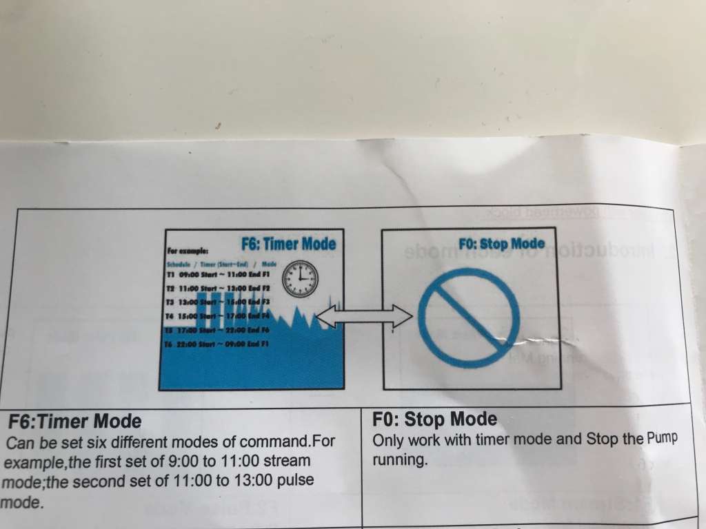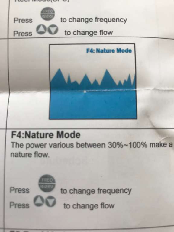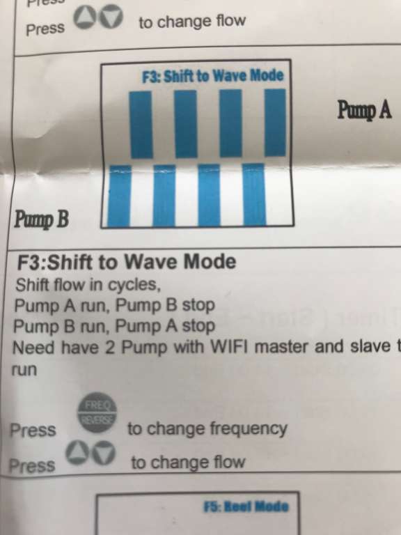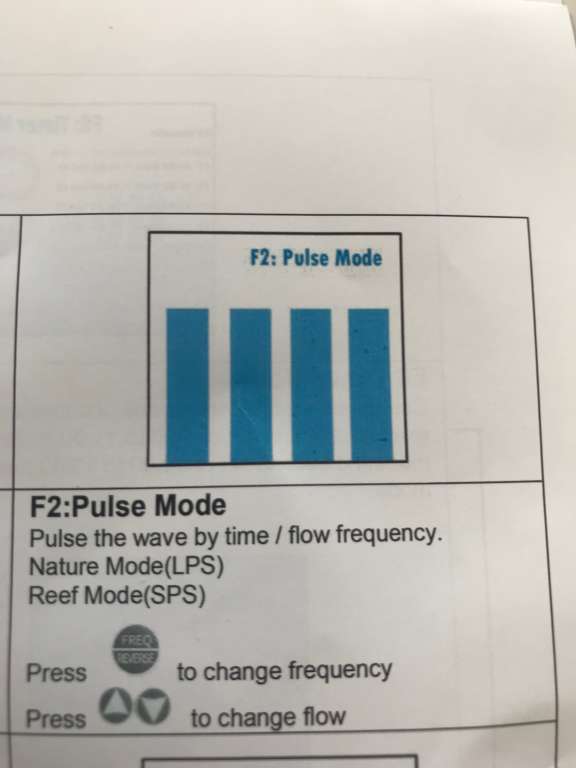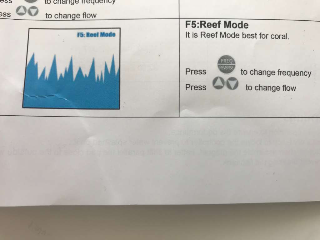 mode F1 er konstant flow hvor den bare blæser der ud af. mode F2 er Pulse mode hvor pumpen udsender impulser så der kommer bølge gange, hvor længe of hvor ofte den skal gøre det er styret på frekvens i midten af controlleren. Mode F3 er også en pulse mode men denne gang er det ved brug af to pumper hvor de skiftevis køre. Mode F4 Nature mode, som er det vi kender fra Lagoon(ecotech mp) LTC (maxspec gyre) lidet mere varieret flow med blødt op og ned. Mode F5 Reefmode, den kender vi også både fra maxpect og ecotech som re deres OTC og Reefcrest de hævder denne er bedst for koraller ( tror her de mener sps)