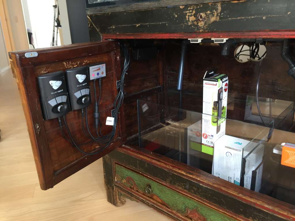 Der er boret hul fra depotet ind til stuen, hvor akvariet står. Ledninger og slanger er trukket fra depot til akvarie gennem muren. F*** der er mange ledninger der skal holdes styr på. :eek: