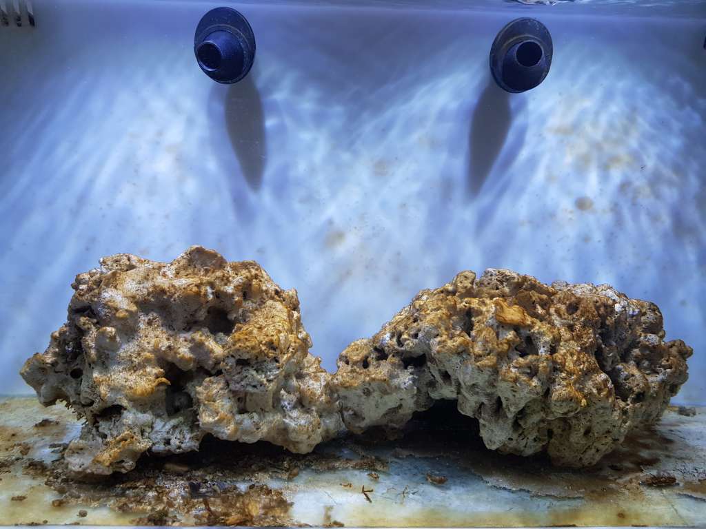 De to sten i akvariet er brugte døde sten, som jeg har skyllet i hanevand. I sumpen bagved display, er planen at putte noget