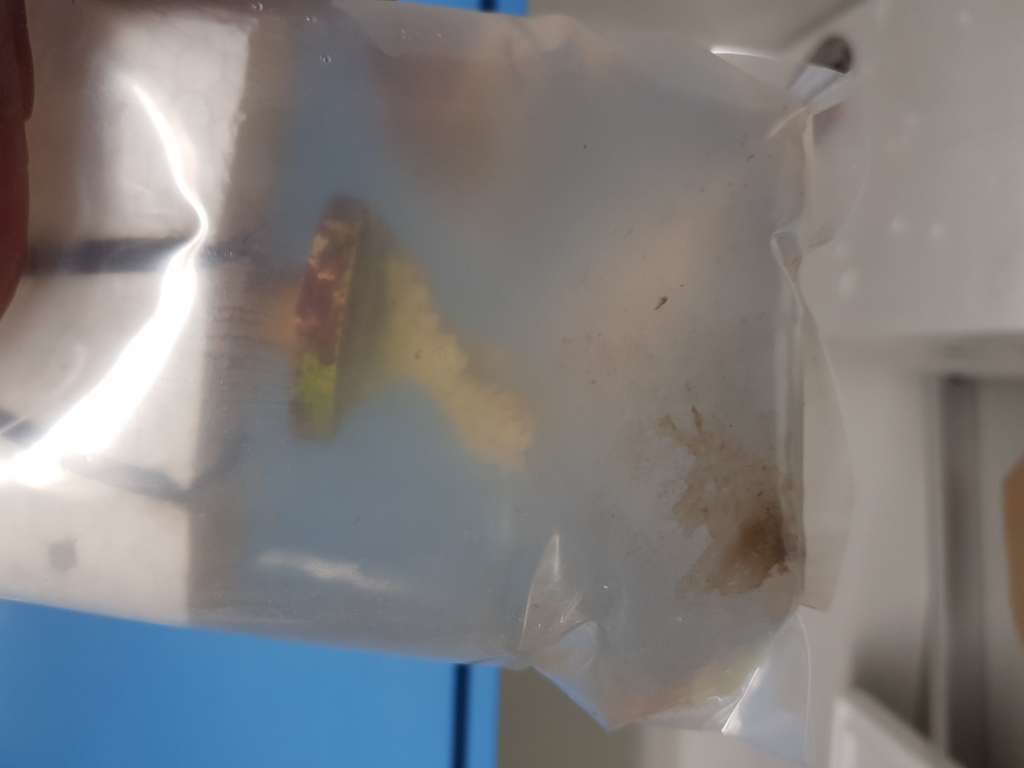 De to døde kom fra samme kasse og jeg tror at det var den kasse der var røget med i en vogn. Da jeg åbner den kasse lægger jeg mærke til, at avispapiret der var lagt over er vådt. Der er ingen poser der er gået hul på, men poserne står ikke alle op. Hæfter mig først ved det bagefter. Så vandet må være røget ud gennem toppen af en pose. De var lukket med elastikker og ikke med klips.