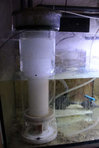 Den er bare en reaktion på at den, ellers nye, tunze skummer jeg havde på lager var elendig. Så har lavet en krop af en gammel kalkreaktor, og sat 3 små luftsten (sander st. 1) i. Kører med en eheim 2 x 200L luft.