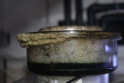 Jeg har lavet en dobbelt bund i skummeren, hvor den nederste har rørføring til luft, og så har jeg lavet en lille blok der kan sidde 3 stk i. Bruger tunzes plastikbolte til at holde det sammen. Tunzeskummeren kunne lave en et par cl tynd the på 2 dage. Her er 2 dages afskumning med den her. Jeg trænger til at få lavet et nyt låg, der på en eller anden måde giver mere plads til skum kan nå at lægge sig. Det er som PU-skum