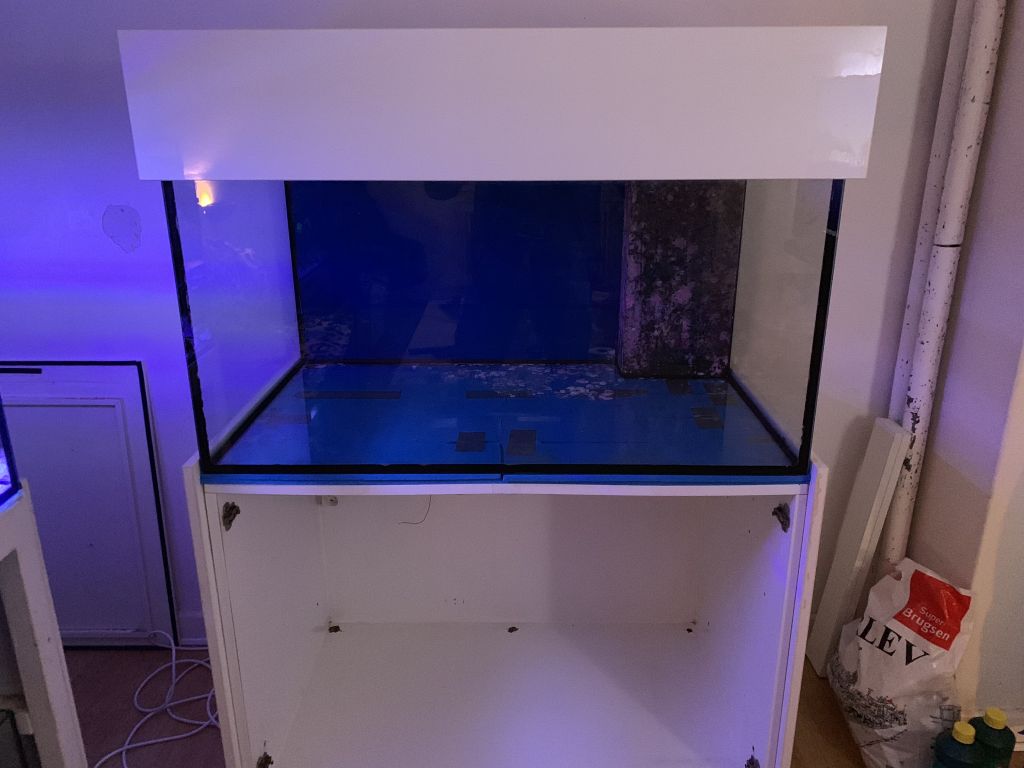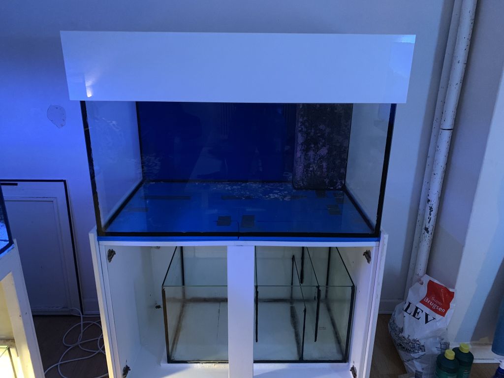 jeg er også nået lidt videre, har fået fjernet kalkalger, og kabinet er vasket ned med klorin, gider dog ikke at gøre det store ud af bund og overløb, der skal alligevel sand på bunden, og overløb regner jeg med at bygge nogle sten op af.
