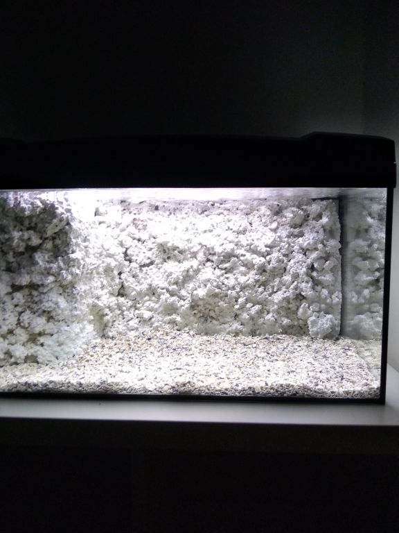 Knægten ligner sin far på det punkt,glad for dyr så selvfølgelig skal han også ha et akvarie på dit værelse. Har derfor været ude og købe sådan et startsæt 54liters og lavet en DIY baggrund med indbygget sump hvor der er plads til skummer,pumpe og varmelegeme.