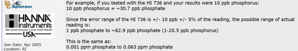 I mine øjne er HI736 et rigtig godt valg til formålet, men det gør da ikke alle andre test sæt ubrugelige. Husk også at HI736 har en nøjagtighed på +/-5 ppb, +/- 5% ( x 3,066 for PO4) og dermed er det jo totalt værdiløst at have spring på 1 ppb i udlæsningen