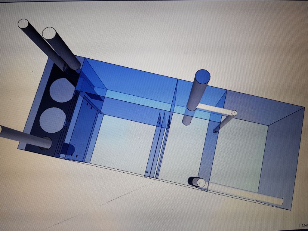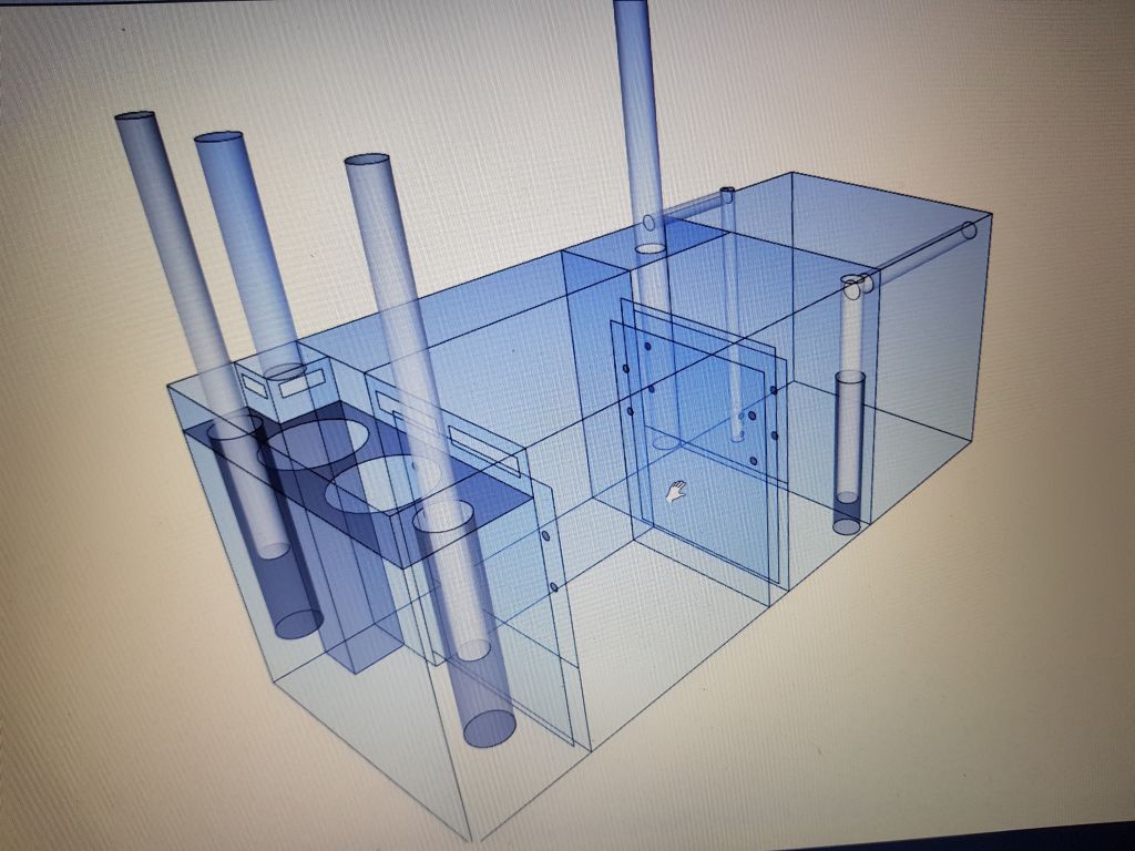 Rørføringen til osmosetanken ( bagerste kammer på langs mellem retur og tilløb) har jeg ikke fået tegnet på endnu. Ligesom jeg heller ikke har fået lagt planerne om hvor jeg skal montere slangeholderen til doseringsmaskinen, men tænkte den del skal side i returkammeret