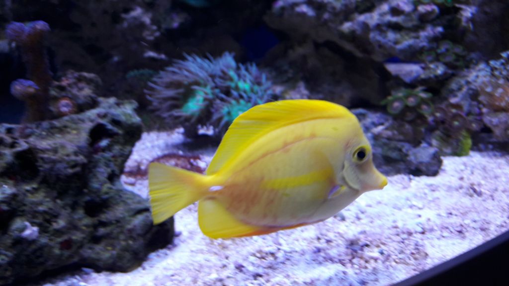 Jeg har haft en mellemstor gul kirurg de sidste 5 måneder og den har fra begyndelsen og til for 1 måned trivedes godt. For ca en måned siden begyndte den at se ud som på nederste billede, men opførte sig stadig helt normalt så vidt jeg kunne se. Jeg sænkede saltindholdet fra 1.027 til 1.026 og fisken fik sit normale udseende igen i løbet af 2-3 dage.