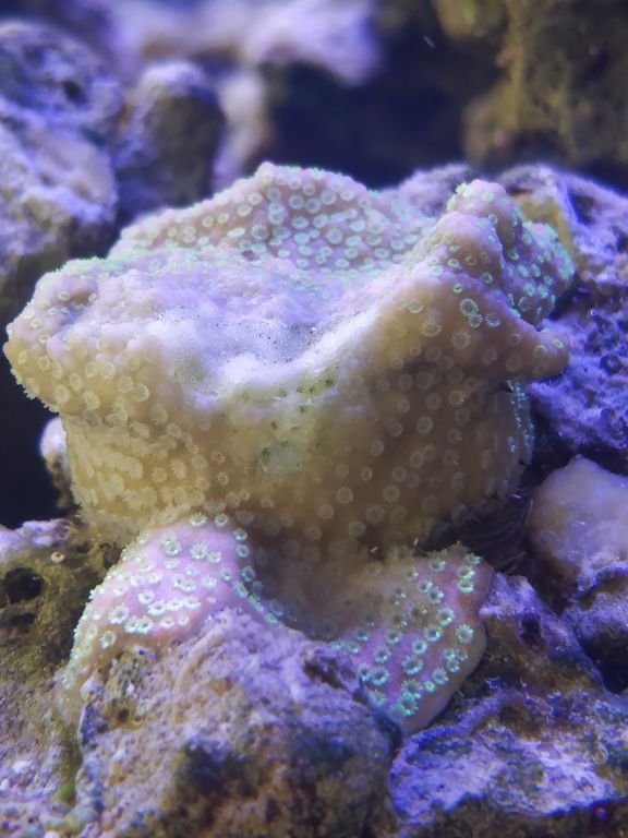 Mit 6 måneder gamle montipora sunset fragment er begyndt at miste væv på en måde jeg ikke har set før :BA Så nu håber jeg, at nogle af jer kloge hoveder kan være behjælpelige med at finde årsag, og måske være behjælpelige med en løsning :beer: Her er lidt billeder af vævtabet taget for få minutter siden.