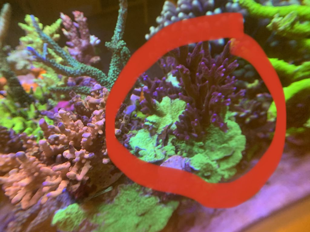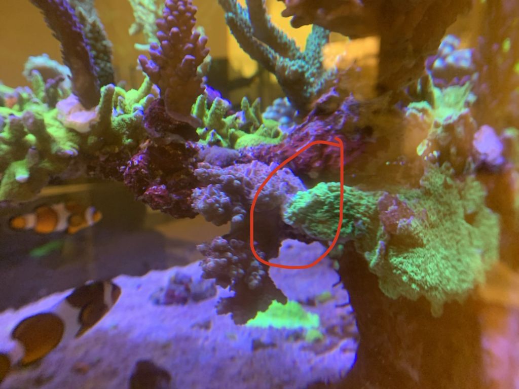 Men nu er den vokset/kravlet så meget at den dels har omklamret en lilla montipora samt endnu værre begyndt at brænde min ene acropora (havde egentlig håbet på acropora ville vinde den kamp