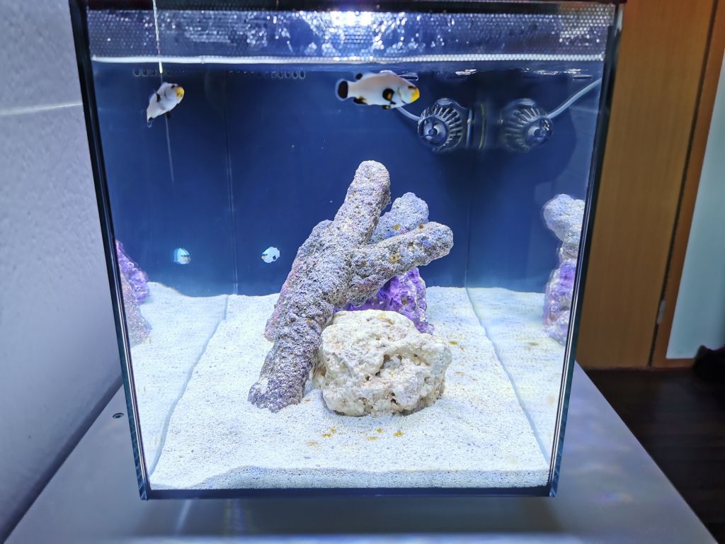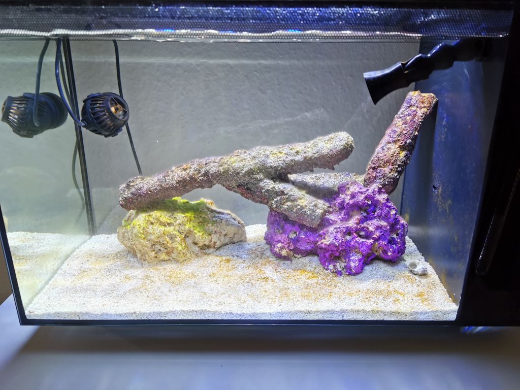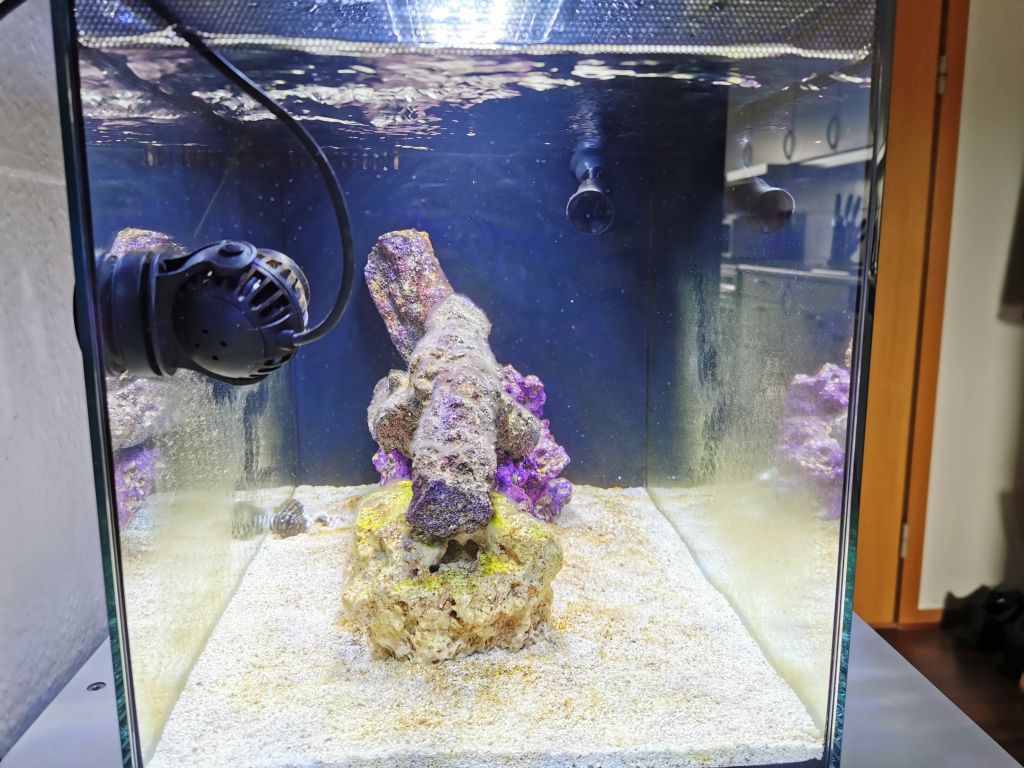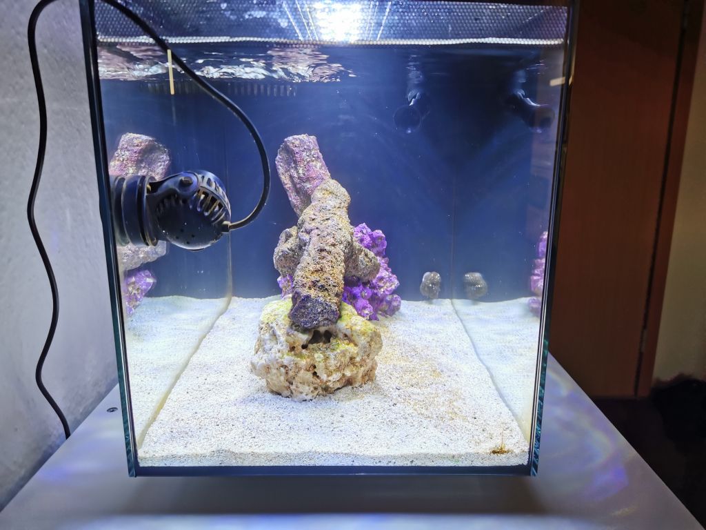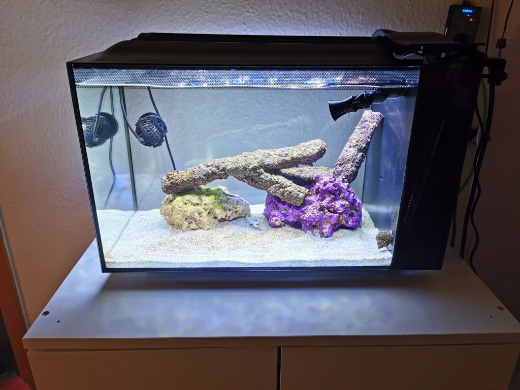 Det står nu og har været igang i lidt over 3 måneder der er kommet lidt liv derinde. "hvilket jeg er hel vild med" Jeg har 1 turbo snegl og en hermit krabbe der overlevede hele turen "indtil videre".