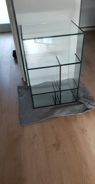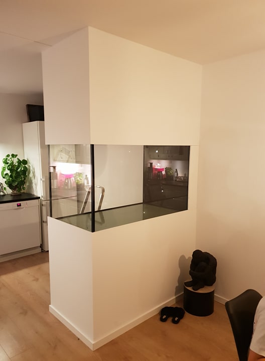 For ikke at ende med et kube akvarie gik vi lidt ned i bredden på akvariet for at mindske pladsen ud mod stuen, og derfor endte vi på 70cm bredde.