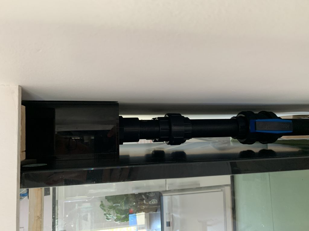 Hold nu kæft en dimension pludselig at komme op i :smart: Det blev jeg noget overrasket over, og det skulle da også vise sig at være vanskeligt at få 4 50 mm 90 gr. rør derned...... Men tømreren havde lånt mig nøglen til hans firma dut så jeg havde allerede adgang til det meste jeg vidste jeg skulle bruge.. Så de røg sig en tur igennem gæringssaven og blev forkortet 1,8 cm og det var tilsyneladende nok. Samtidig fik gevindstykkerne fra akvariet og ind i overløbs kassen sig også en tur, da disse også var for lange. Men der blev plads til det hele til sidst :)