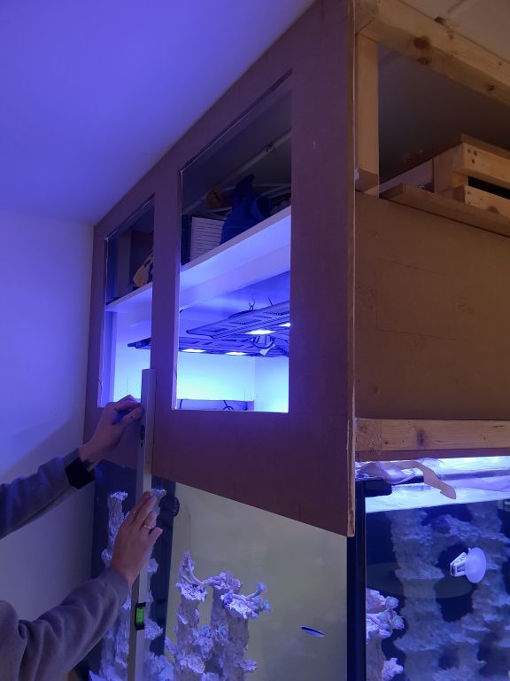 Mens at Bima knoklede med at fremstille akvariet, så gik jeg rundt med mine 10 tommelfingre og forsøgte mig med at lave et akvariemøbel (møblet er Porsa, beklædningen MDF). Mit mål med dette opsæt, er at lave det så "diskret" som overhovedet muligt, sådan at det ikke vælter ud med ledninger alle vegne, men at der derimod er tænkt over detaljerne (inden for de rammer jeg nu evner det). Tanken med skabet er at skabet skal indeholde alt elektronik, computere, doseringspumper osv. uden at de springer i øjnene når man åbner skabet. Derimod vil jeg gerne opnå at det er pænt og overskueligt udaftil også kan der rode "bagved".