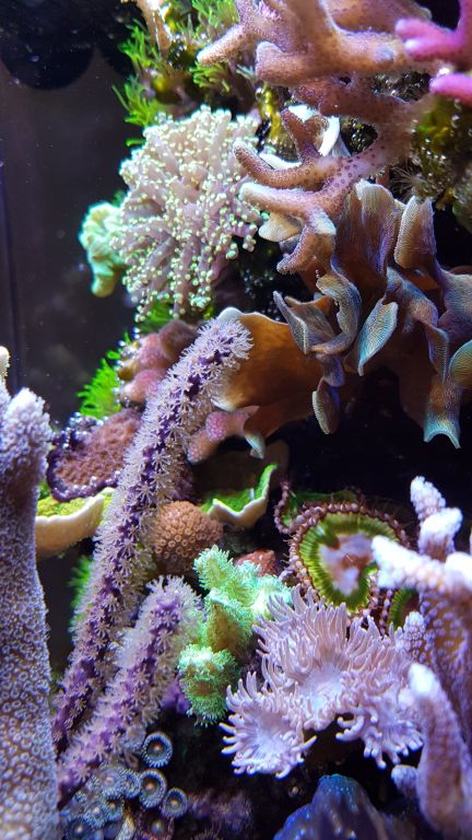 Det kører bare derudaf. Alt gror så meget, at der af og til må klippes eller erstattes koraller med nogle mindre. Ud over de ca. ugentlige vandskift og en tur med algemagneten hver anden dag, er der ingen pasning af baljen. For at spare lidt på saltet, når man nu skal bruge 60-80L skiftevand om måneden, er jeg begyndt at bruge halv genbrugsvand fra når jeg skifter vand på baljerne derhjemme. Det fungerer fint og halverer dermed saltforbruget.