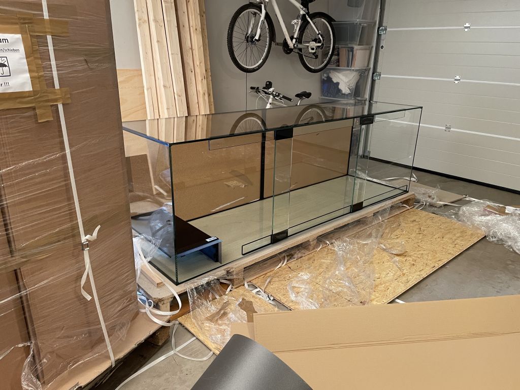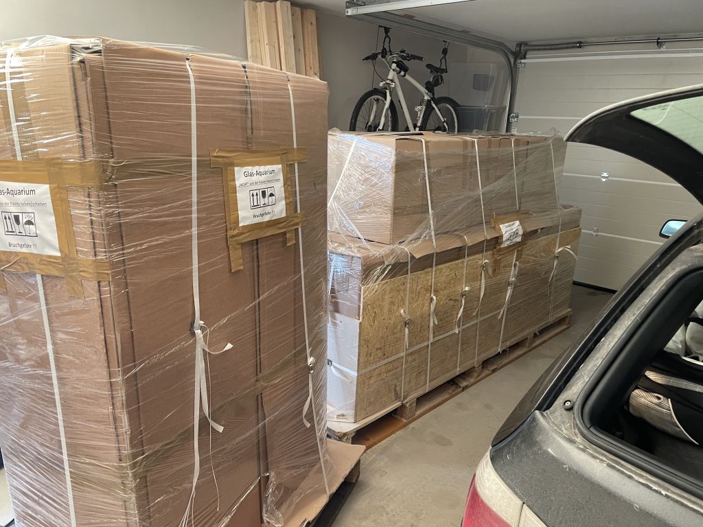 Så kom akvarierne endelig - selvfølgelig allesammen på en gang. Det sjove bliver at få displaytanken flyttet ind på sin plads