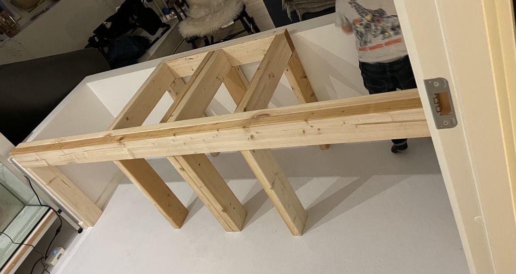 Så blev jeg næsten færdig med anden reol, og kom igang med prøvesamling af supplerende understøtning til det store akvarie. Primær understøtning er murede søjler på front og i siderne.
