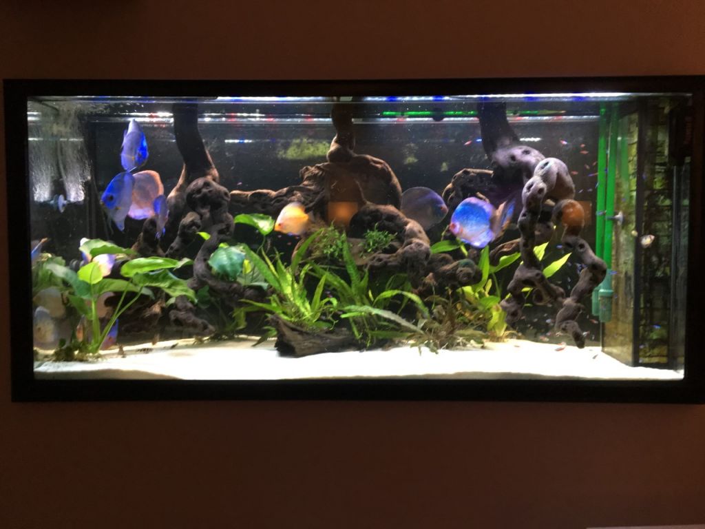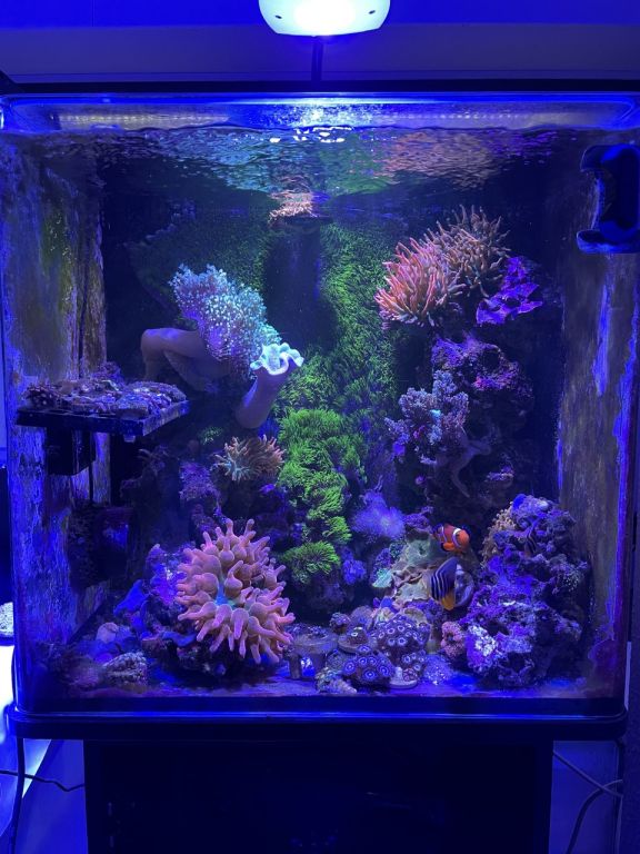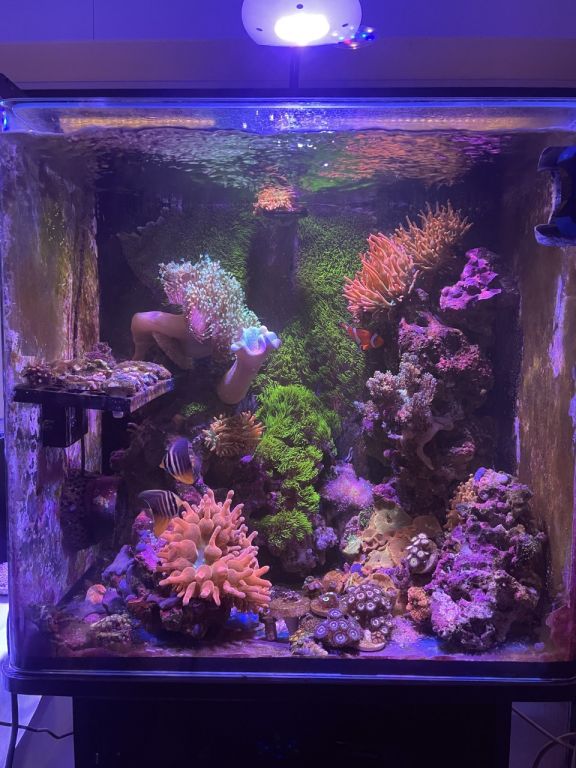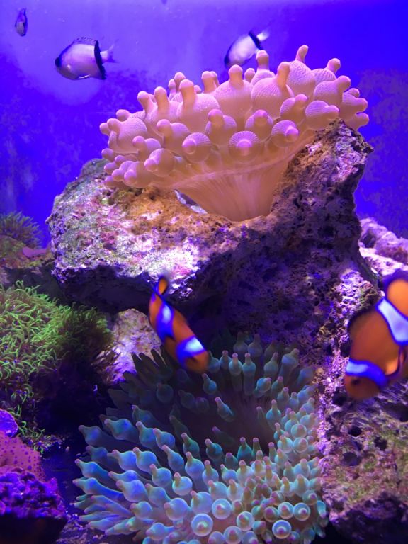 Hurtigt fik vi indbygget det lækre akvarie i stuen og fyldt discus i. Til stor fornøjelse og glæde for alle, samt pengepungen. Det har vi den dag i dag stadig med Discus og lidt småfisk. I et par år havde vi stadig 3-4 forskellige akvarier kørende med en Axolotl (salamander), Moskusskildpadder, Cichlider og havedam med forskelligt. Fine farver og forskelligartet bevægelse og en gave til børn der bare elsker det. Så jeg var uden saltvand i et par år, og på trods af at jeg havde besluttet aldrig mere saltvand. Så manglede der noget, og min kone blev gravid i 2018. Så tænkte jeg, vores lille pige skal sku ikke vokse op uden et akvarie med et par klovnefisk.