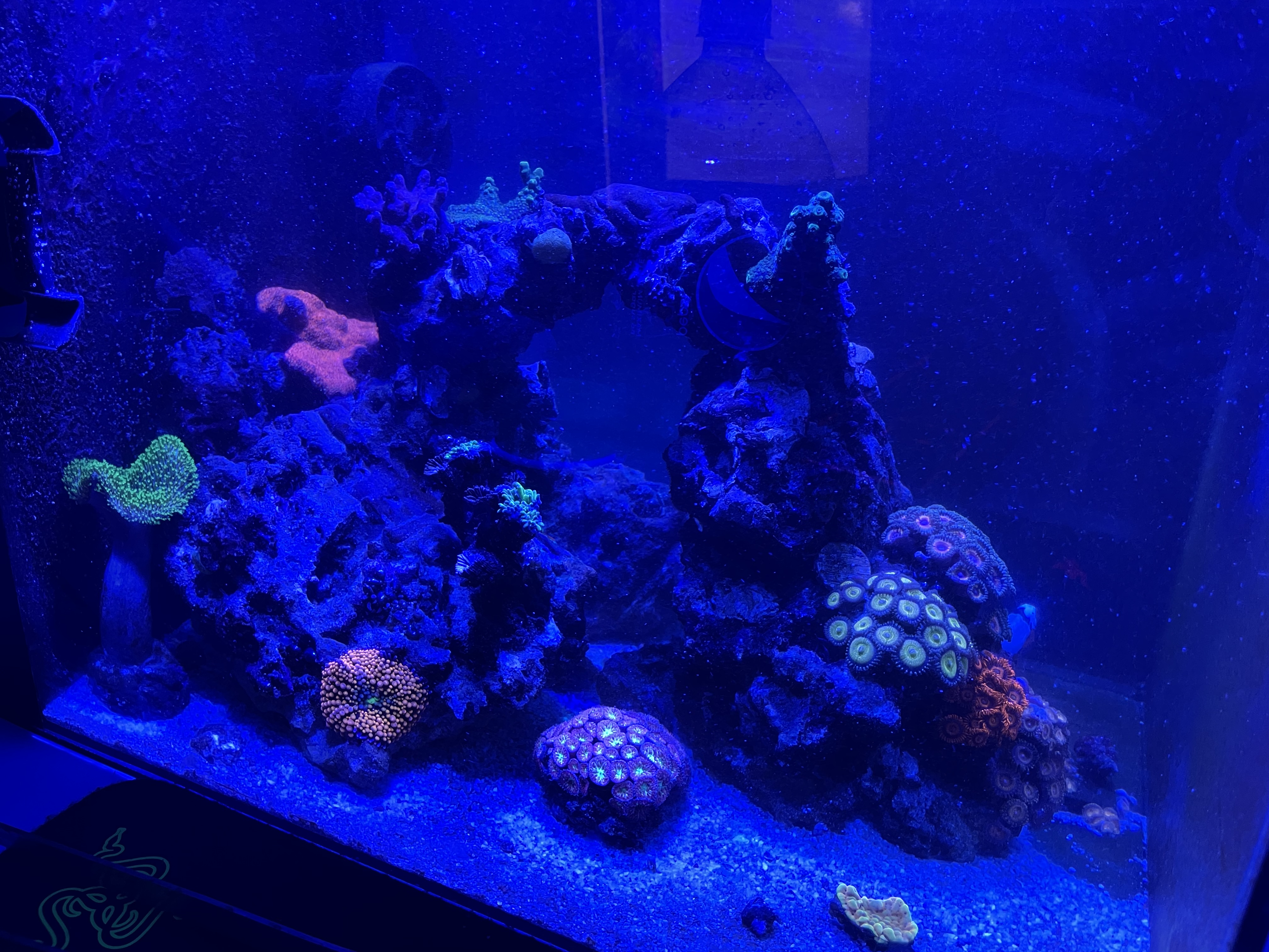 Filfisken har taget de fleste aiptasia og de 2 mithrax krabber gør deres for at hold bestanden af boble alger i skak. Jeg er imponeret over dem - de går hele tiden og spiser noget af skidtet på stenene :)