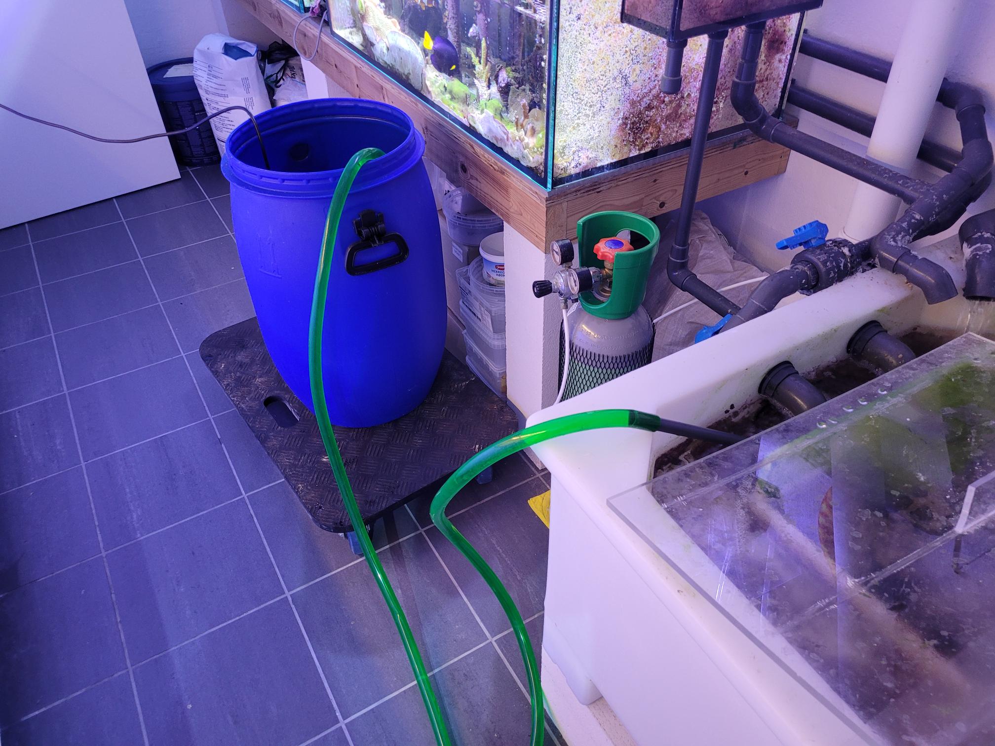Jeg starter med at koble min vandskifte sump fra systemet. Det giver mig 180 L at arbejde med. Så pumper jeg 60 L op i en blå bøtte, som jeg fylder tilbage på systemet. Så har jeg 60 L at bruge af til en start. Jeg suger op og bruger en bøtte magen til til spildevand og slam, så jeg hele tiden holder styr på min salinitet. Når ATO starter ved jeg også, at nu har jeg brugt de 60 L. Det er en ekstra sikkerhed.