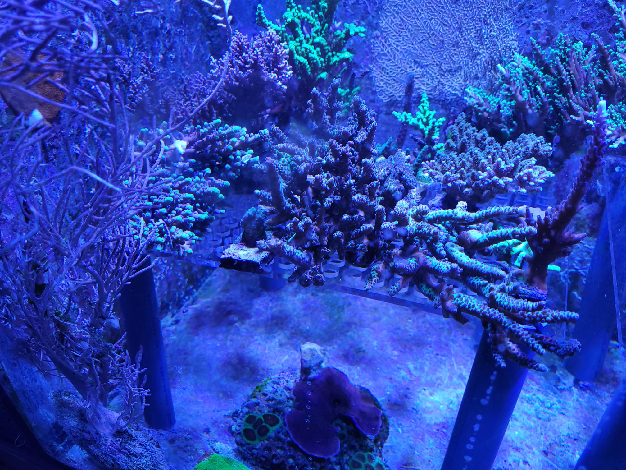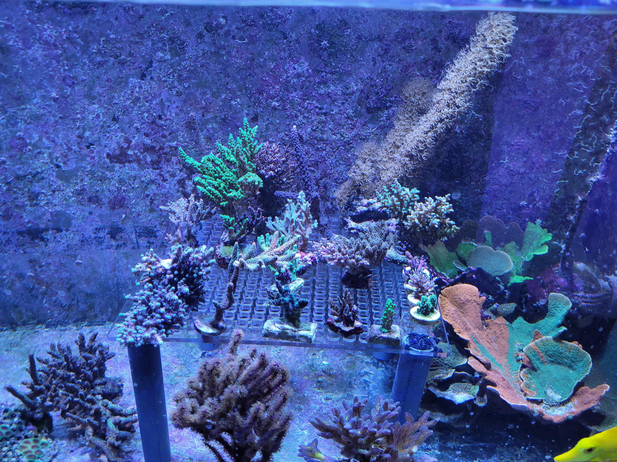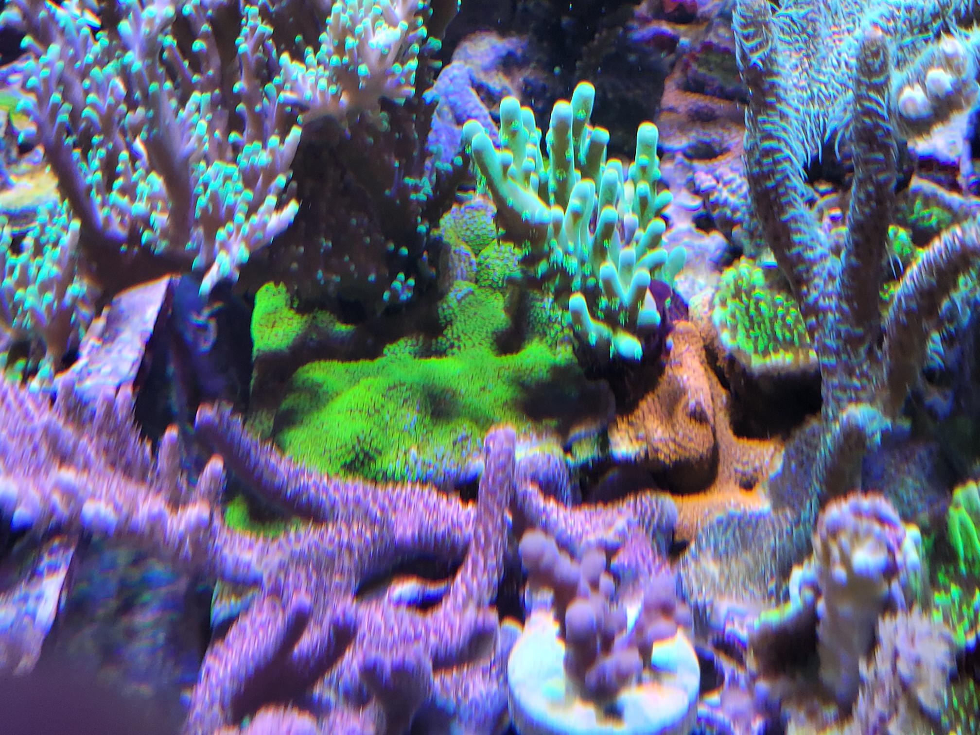 Efter jeg har haft mit Majano helvede, hvilket stadig kører, omend på lidt lavere niveau end tidligere, så har jeg flyttet mange koraller for at redde dem. De er pillet ud af revet, det døde klippet af og resten er fragget og sat på tiles inde i fragment tankene. Da det ikke bare er en enkelt eller to, så fylder det selvfølgelig en del. De frags vokser til og bliver større og større. De encruster ud over "gulvet" som de står på og bekriger hinanden på den måde. Nogle er mere aggressive end andre. De vokser hurtigere og ser ingen hindring i, at en koral er væsentlig større end dem. De moser bare på.