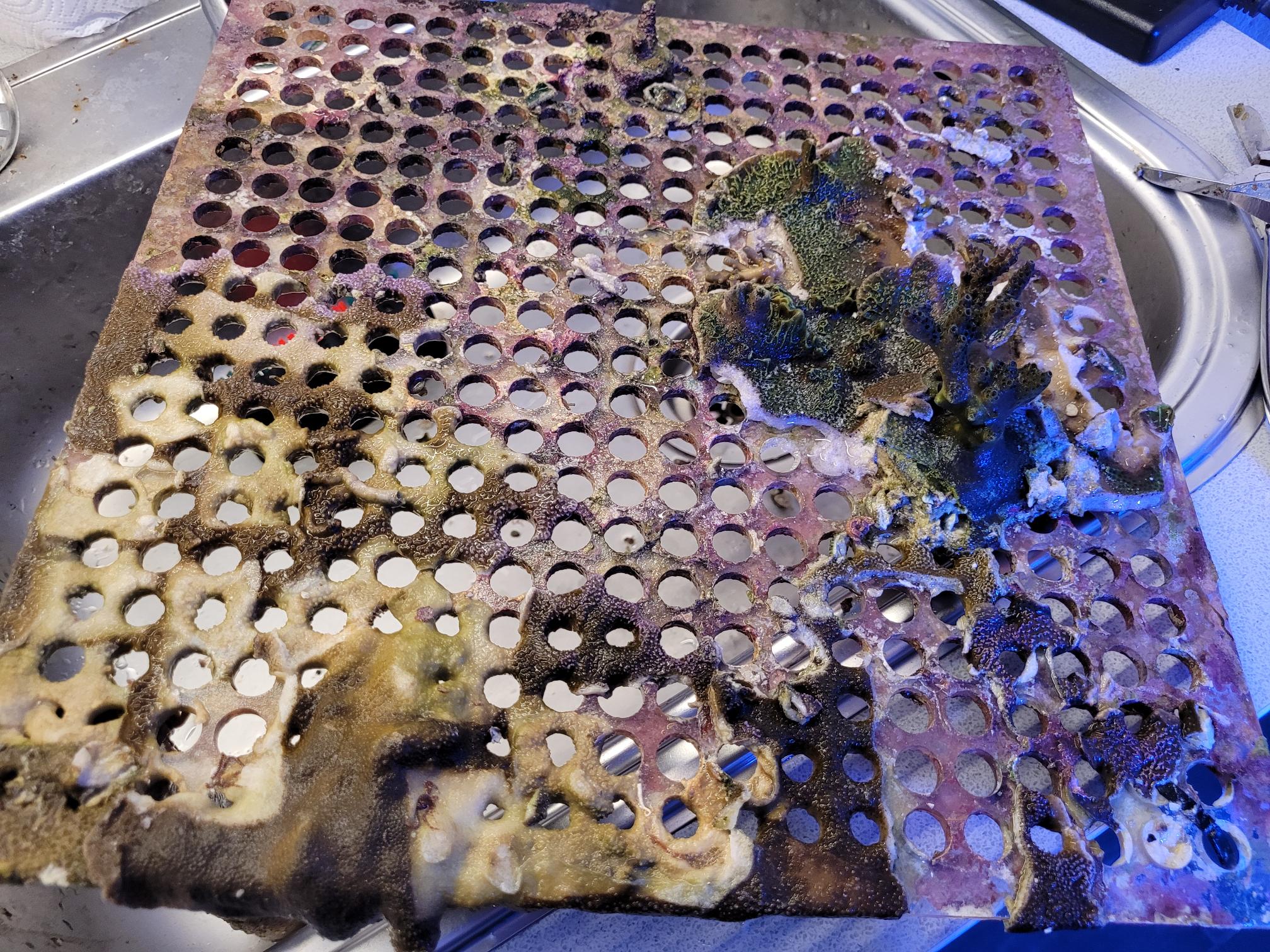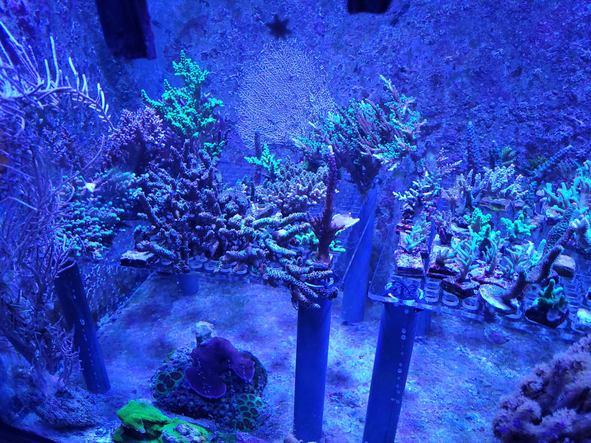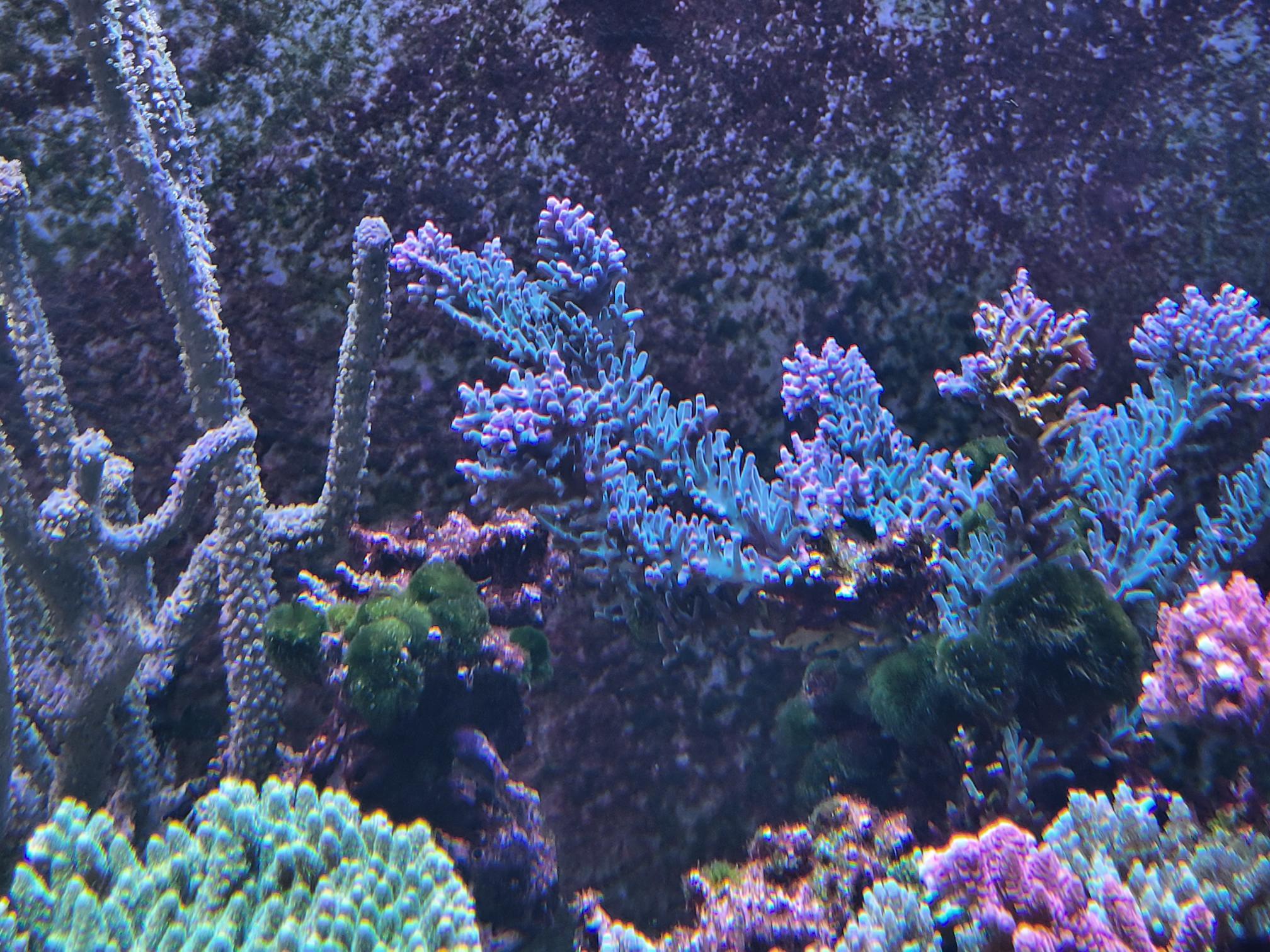 Efter jeg har haft mit Majano helvede, hvilket stadig kører, omend på lidt lavere niveau end tidligere, så har jeg flyttet mange koraller for at redde dem. De er pillet ud af revet, det døde klippet af og resten er fragget og sat på tiles inde i fragment tankene. Da det ikke bare er en enkelt eller to, så fylder det selvfølgelig en del. De frags vokser til og bliver større og større. De encruster ud over "gulvet" som de står på og bekriger hinanden på den måde. Nogle er mere aggressive end andre. De vokser hurtigere og ser ingen hindring i, at en koral er væsentlig større end dem. De moser bare på.