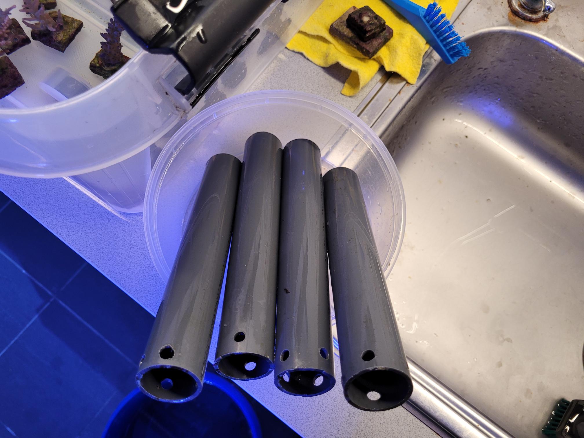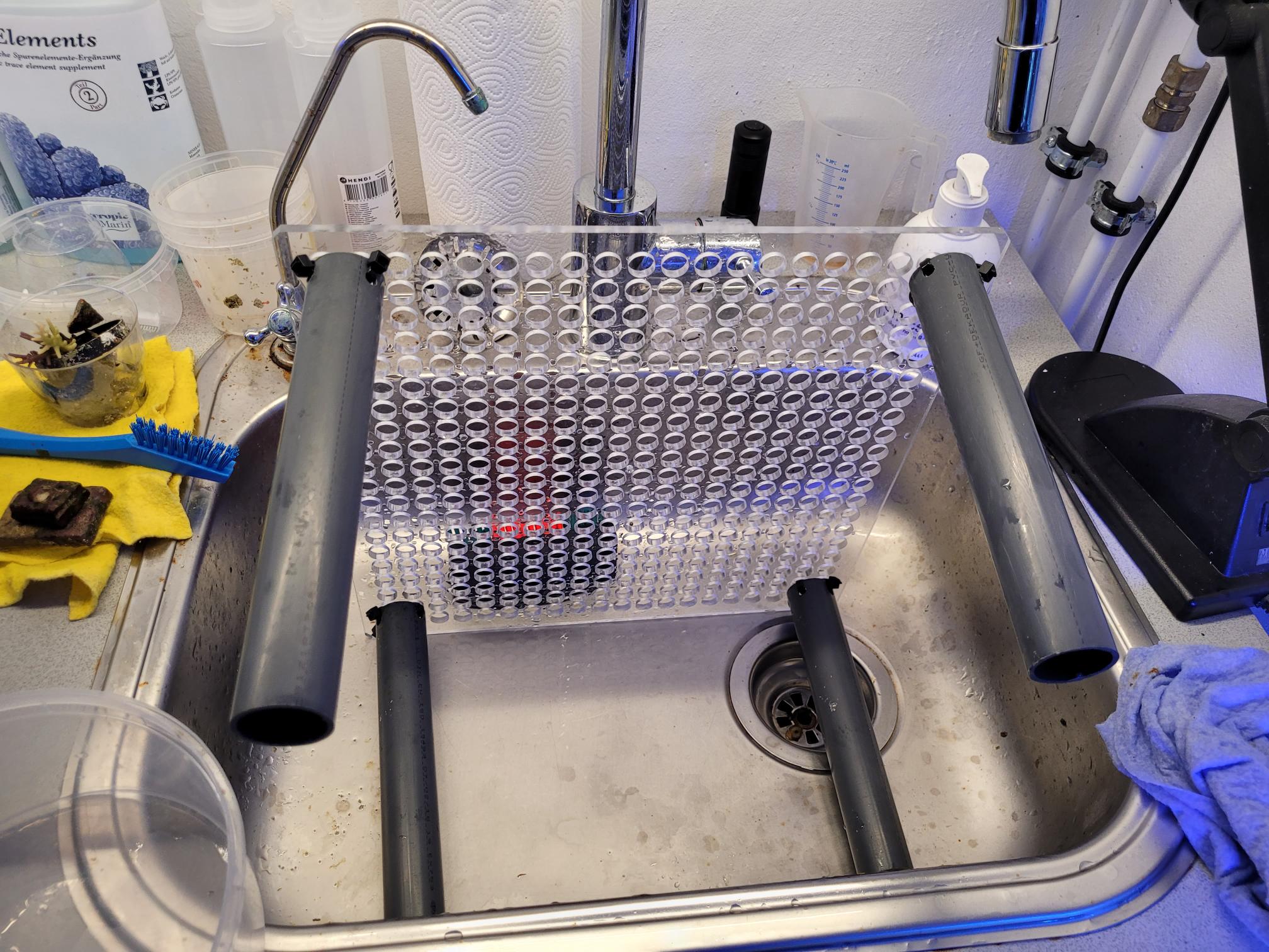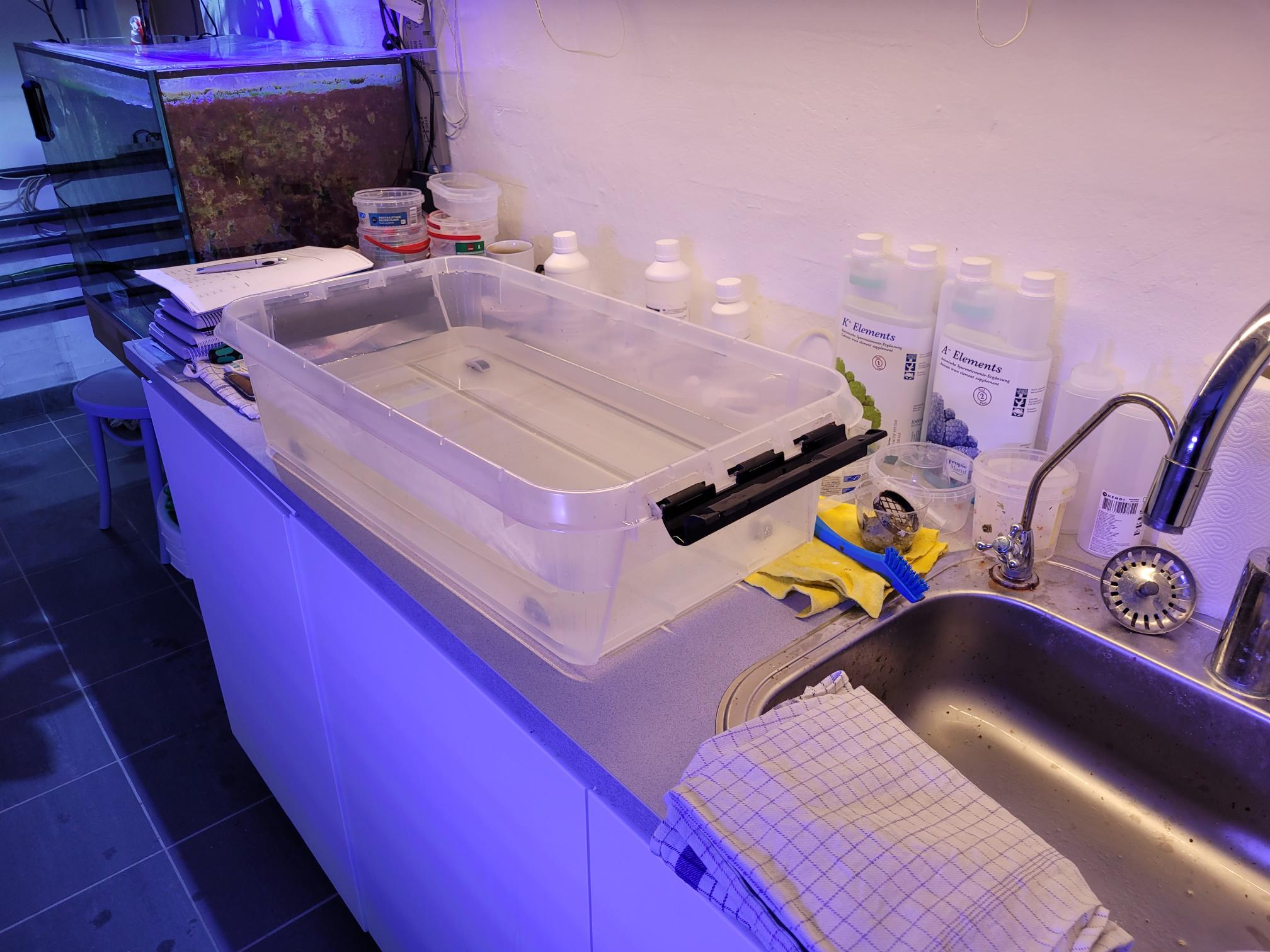 Når man skal lave sådan en opgave, skal der bruges en masse saltvand. Der samler sig en bunke skidt i bunden af sådan en fragtank, det kender alle til. Selvom jeg suger på bunden regelmæssigt, gør det ved hvert vandskift, så er der meget som ikke kommer med op. Der står koraller på bunden og de besværliggør slamsugningen. Fakta er, at når "gulvet" er pillet op, så kan man komme til og få lavet et ordentligt arbejde.