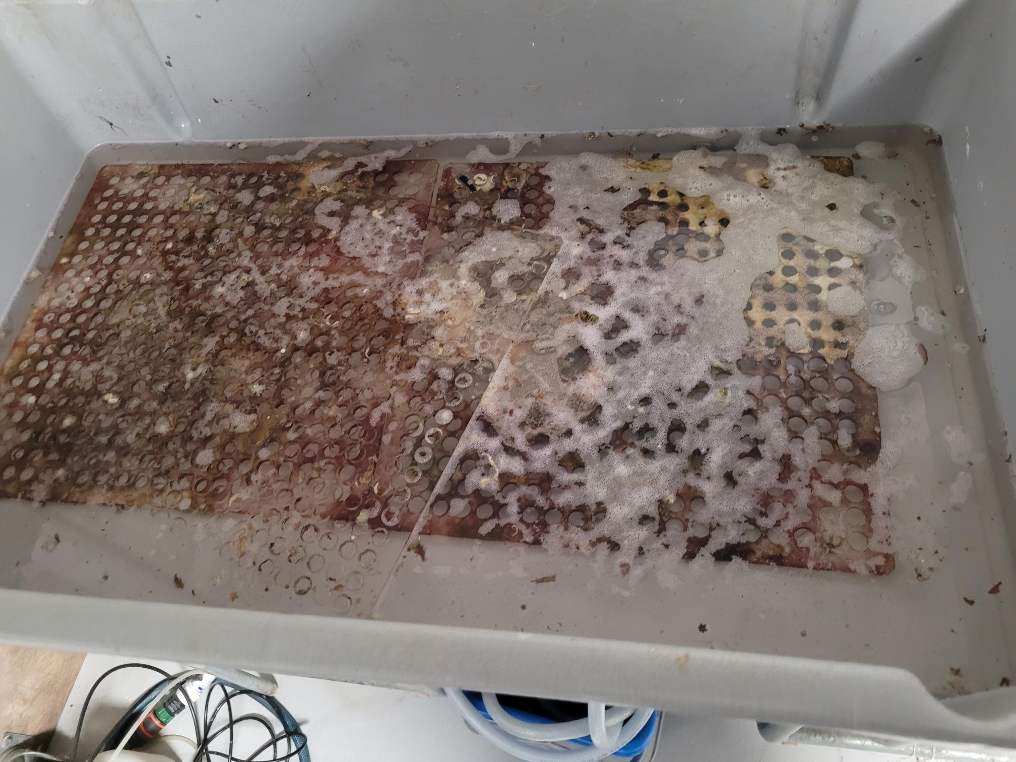 Da jeg var cirka halvvejs, var vandet brugt. Så jeg måtte hente 60 L mere. Så i alt brugte jeg 150 L på øvelsen. Fik også suget bunden i skummersumpen og fik hevet lidt alger og cyano op fra displayet. Så alt i alt en god dag. Start 12.25 og slut omkring Kl 19.30, med en indlagt frokost, da der var Formel 1 og håndbold landskamp. Benene fra "gulvet" skulle alligevel ligge i syre i en rimelig tid. Så det passede.