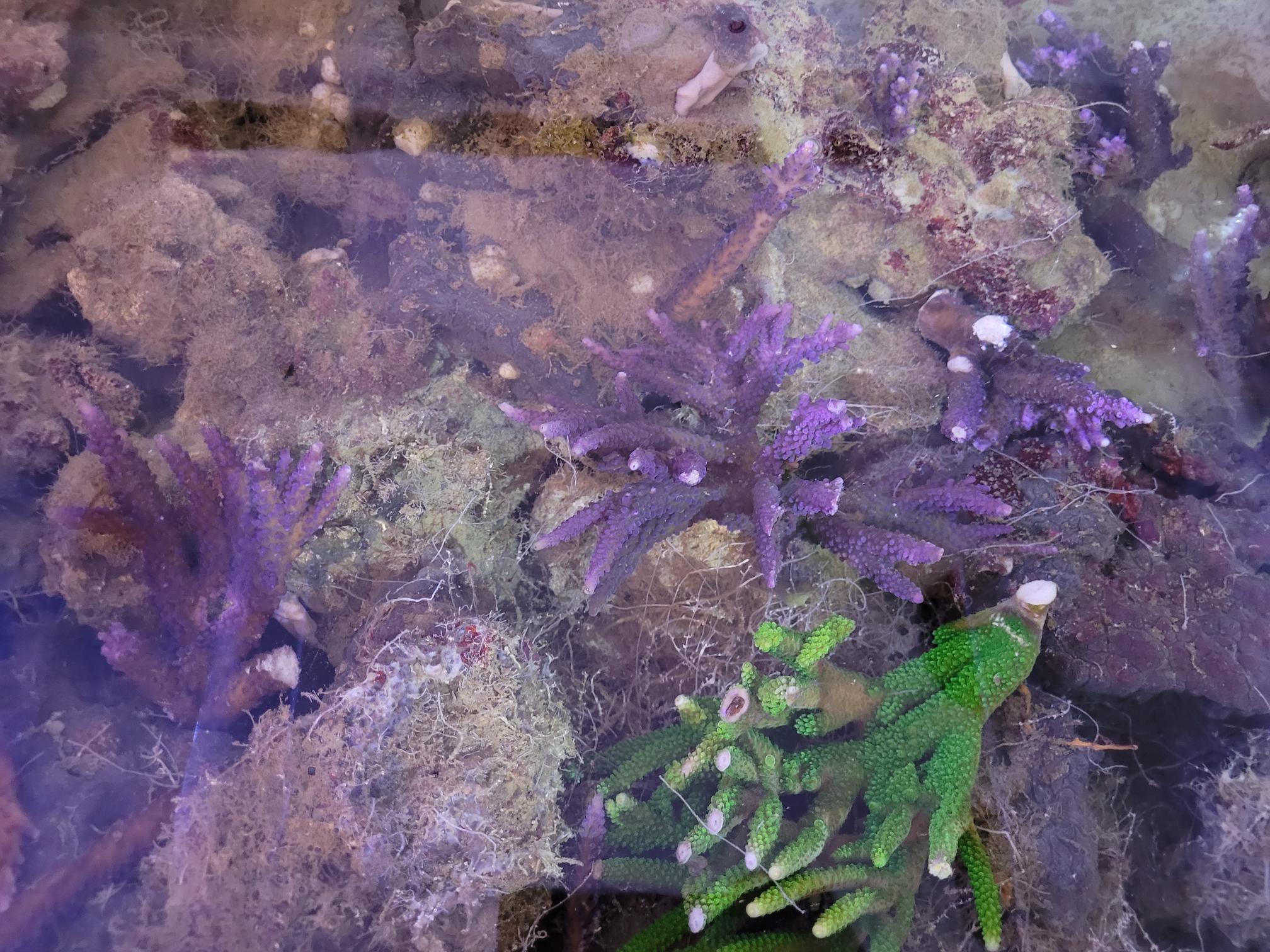 Jo, for nogle gange er det ikke en koral, som jeg ønsker skal brede sig der gør det. I den ene fragtank er det en Montipora spongodes, som jeg egentlig har udfaset, der gør det. I den anden fragtank er det en Favites pentagona. Den vil jeg dog gerne beholde, men kontrollere.