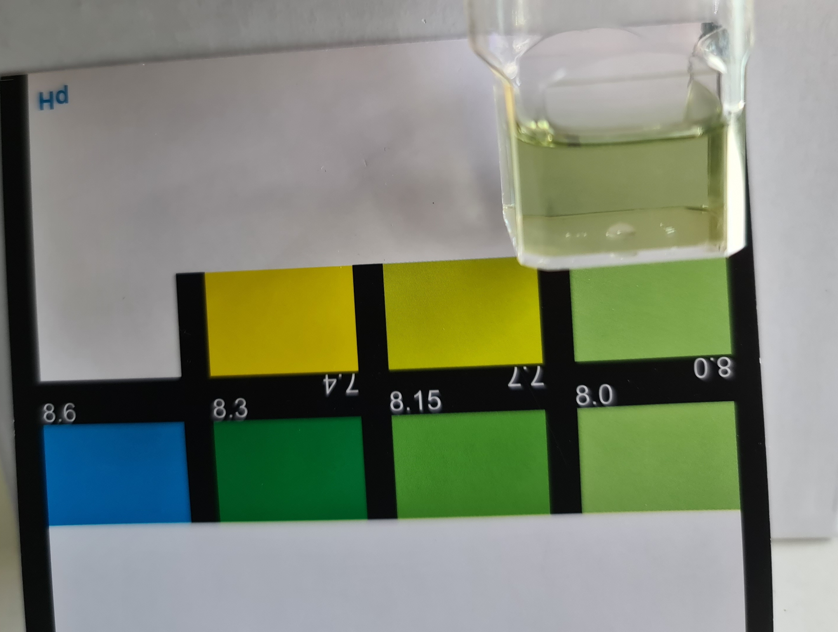 Efter de 4 timer testede jeg vandet og jubii havde nu ser den mere grøn ud end mit normale, så mit bud er at den er tættere på 8 end 7.7 🥳