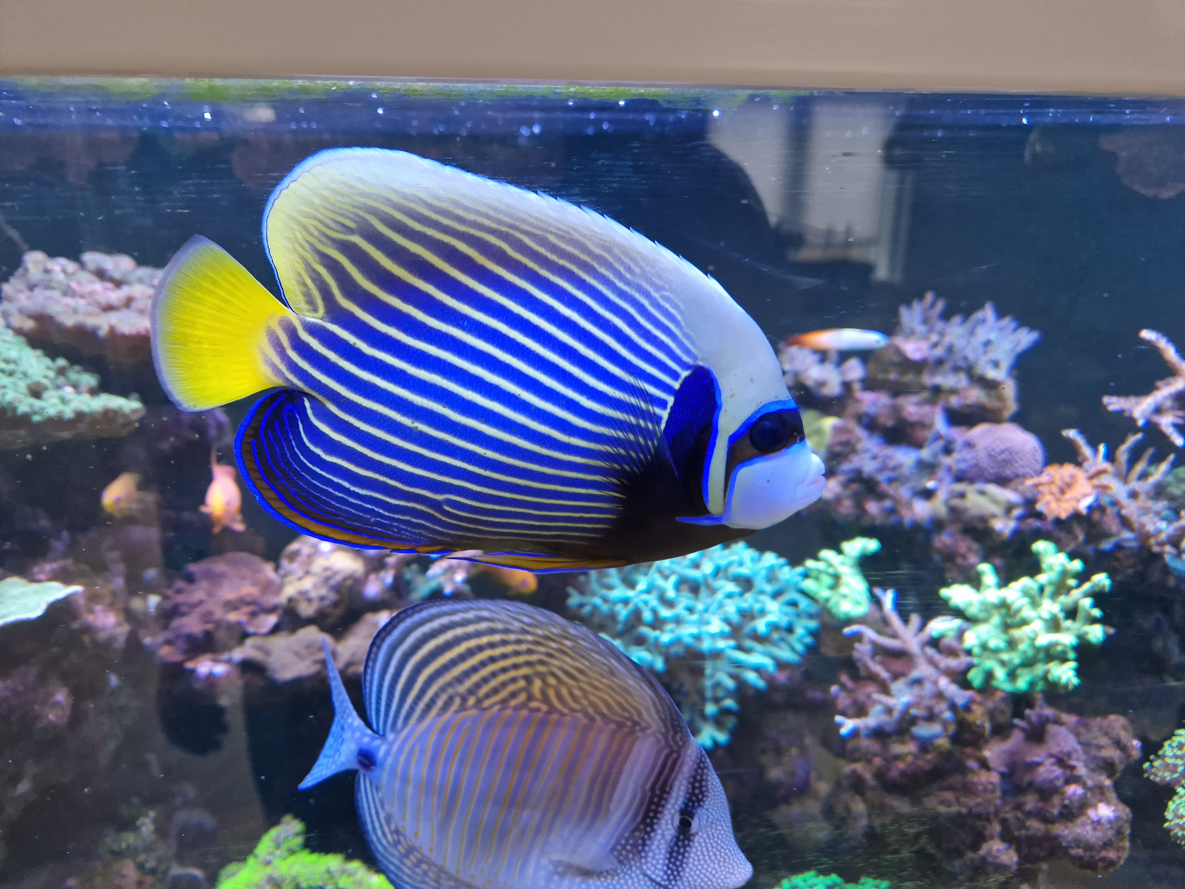 Jeg har en Imperator og en Navarchus, samt tre dværg kejsere ingen problem med SPS'er, har ikke mange LPS'ere i baljen ud over hammerkoraller, lidt Caulastrea og en Duncan. De andre står i sumpen, men jeg vil gerne have dem op når der er plads.