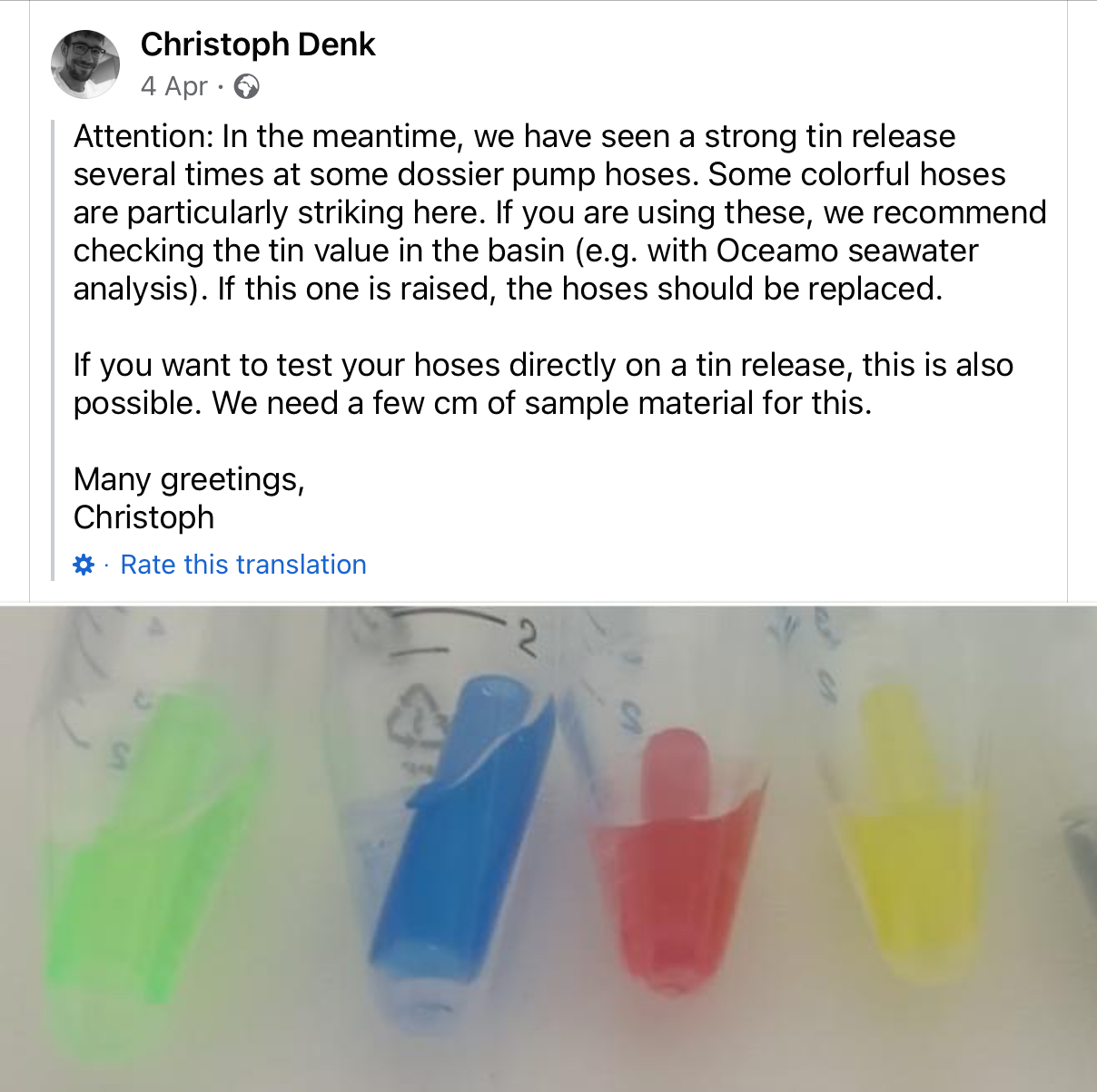 Attention: In the meantime, we have seen a strong tin release several times at some dossier pump hoses. Some colorful hoses are particularly striking here. If you are using these, we recommend checking the tin value in the basin (e.g. with Oceamo seawater analysis). If this one is raised, the hoses should be replaced.