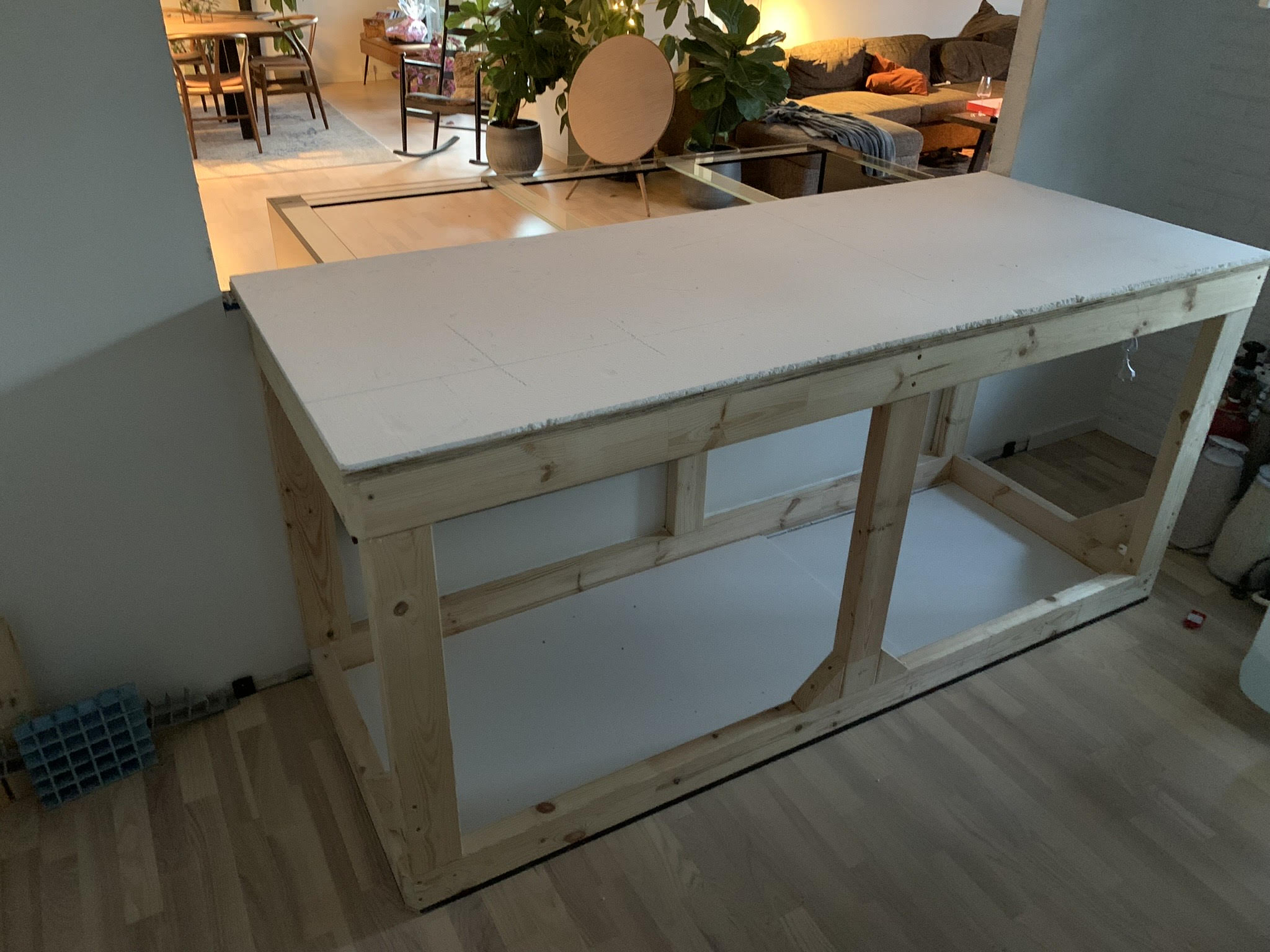 Er bygget af Thomas fra TF aqua, det består af ca- 80 kg levende sten der “svæver” på en plade fra ende til ende. understøttet at pvc rør, det hele er skjult af levende sten.