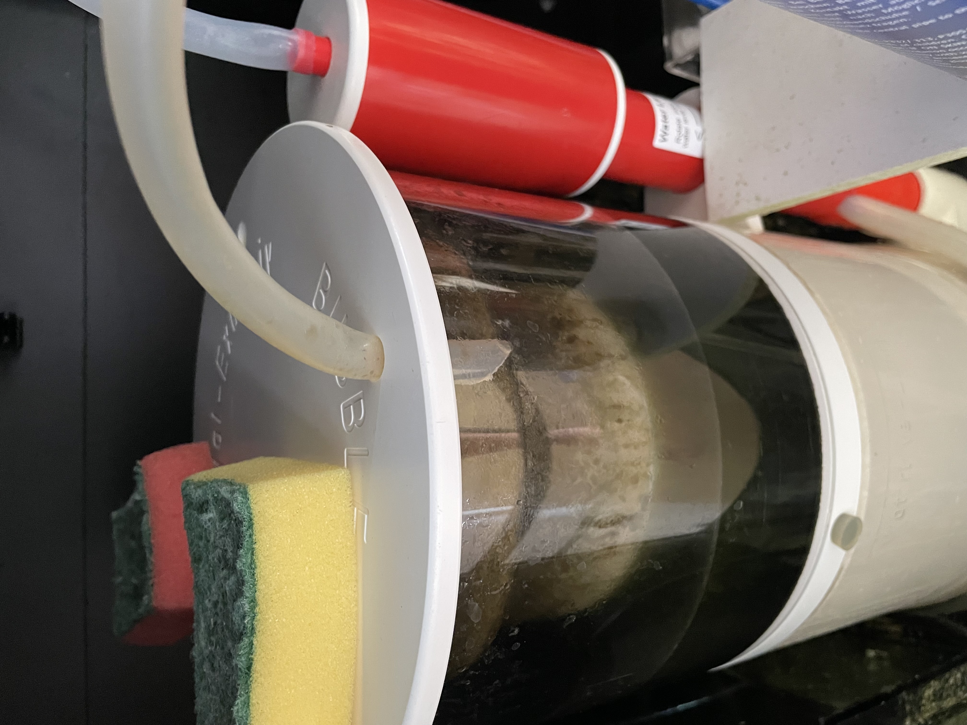 Så fandt jeg lidt grej og lavede min første diy co2 scrubber med recirkulation. Den fugtige luft fra skummer koppen suges over i toppen af beholderen. Beholderen er fyldt med kalkwasser pulver og grov filter svamp, så pulveret ikke presses sammen.