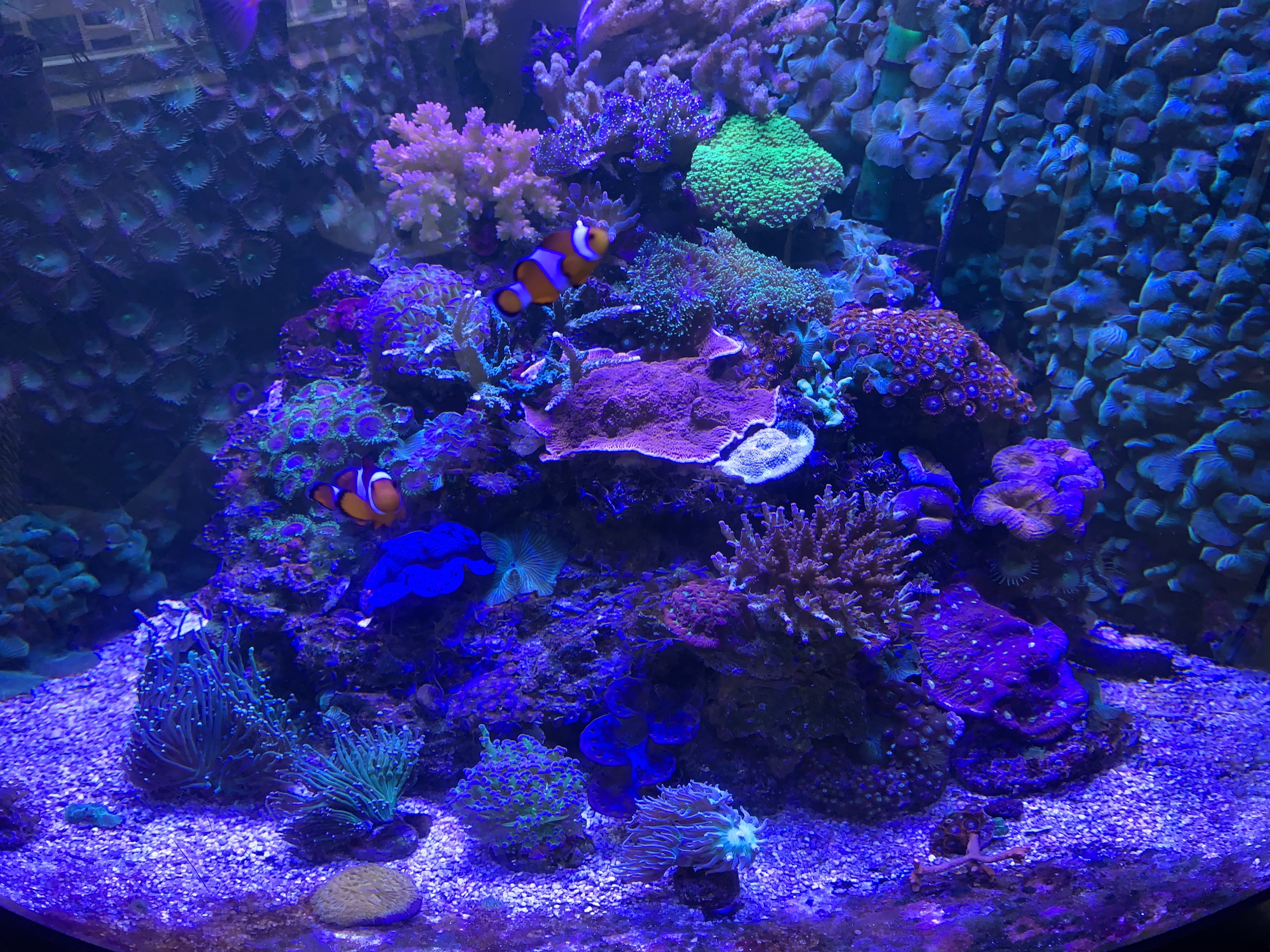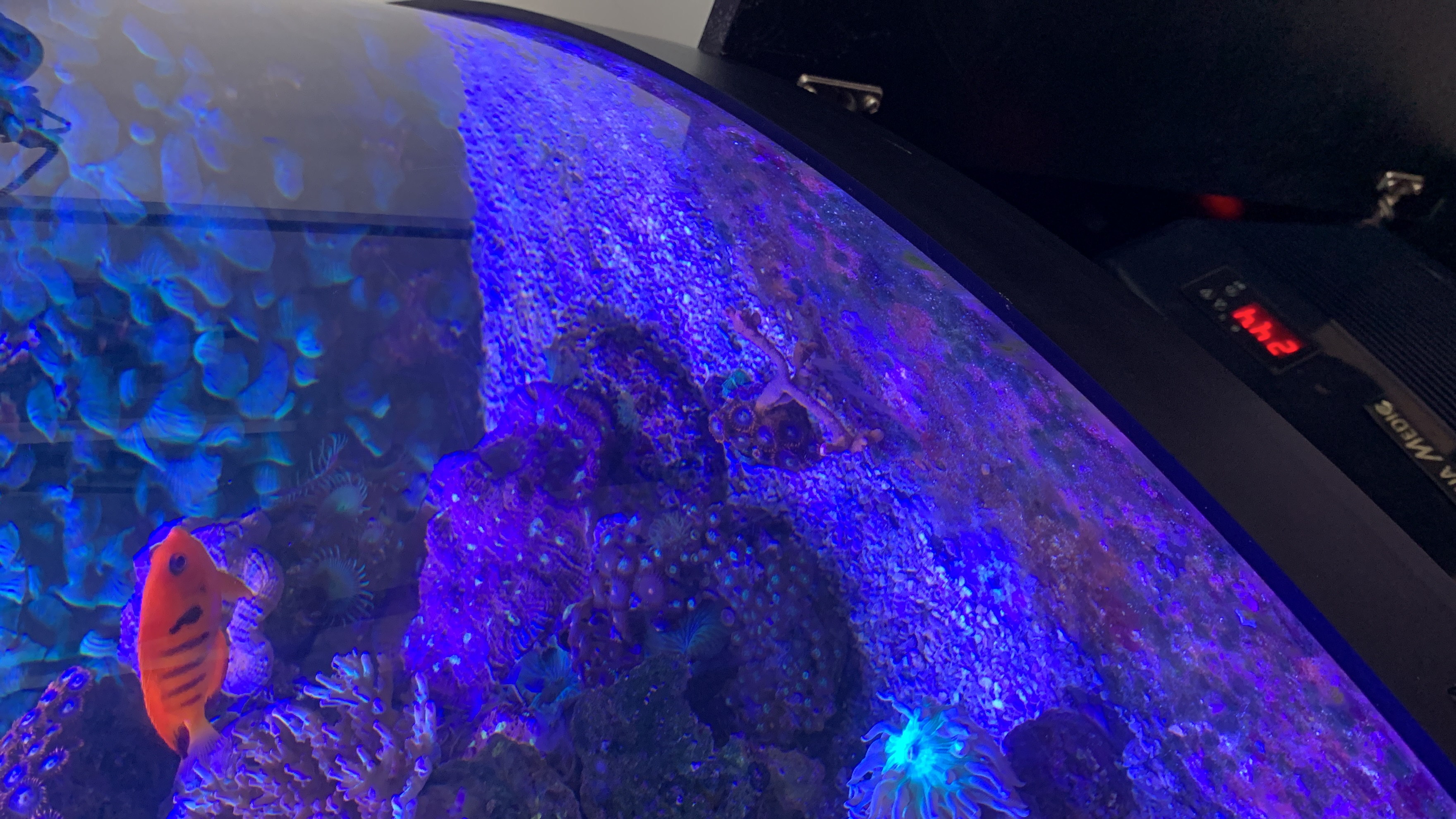 Der er 4 fisk, koral vogter, ildkejser, 2x klovnefisk - havde en gul kirurg i 15 år inden den stod af her for et par mdr siden samt en palet i 17 år der døde lidt før, ka faktisk se at der kommer algeplanter frem nu så man skal nok ha en fisk eller 2 igen