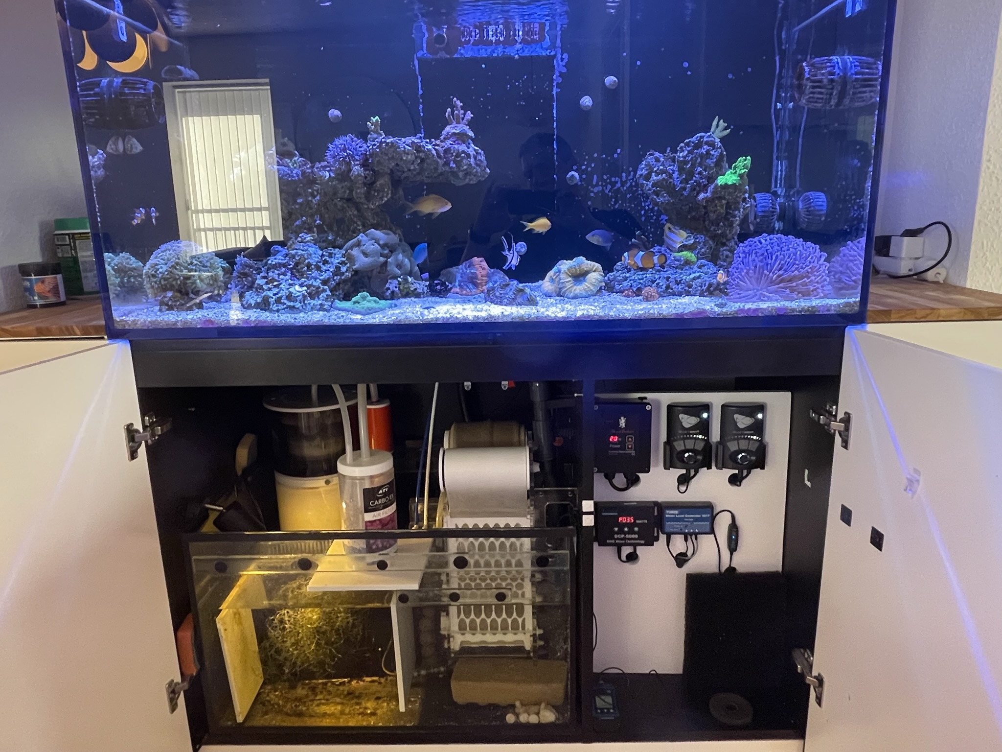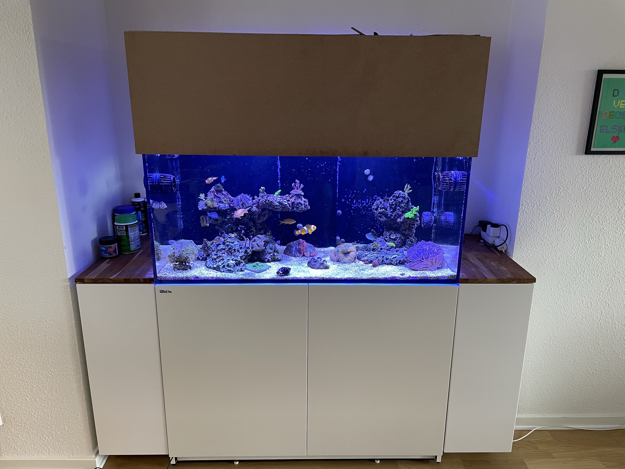 Red Sea Reefer 425XL. Tilstødende IKEA skabe også har jeg lige bygget mig en top som skal males i samme farve som akvariet, hvis
