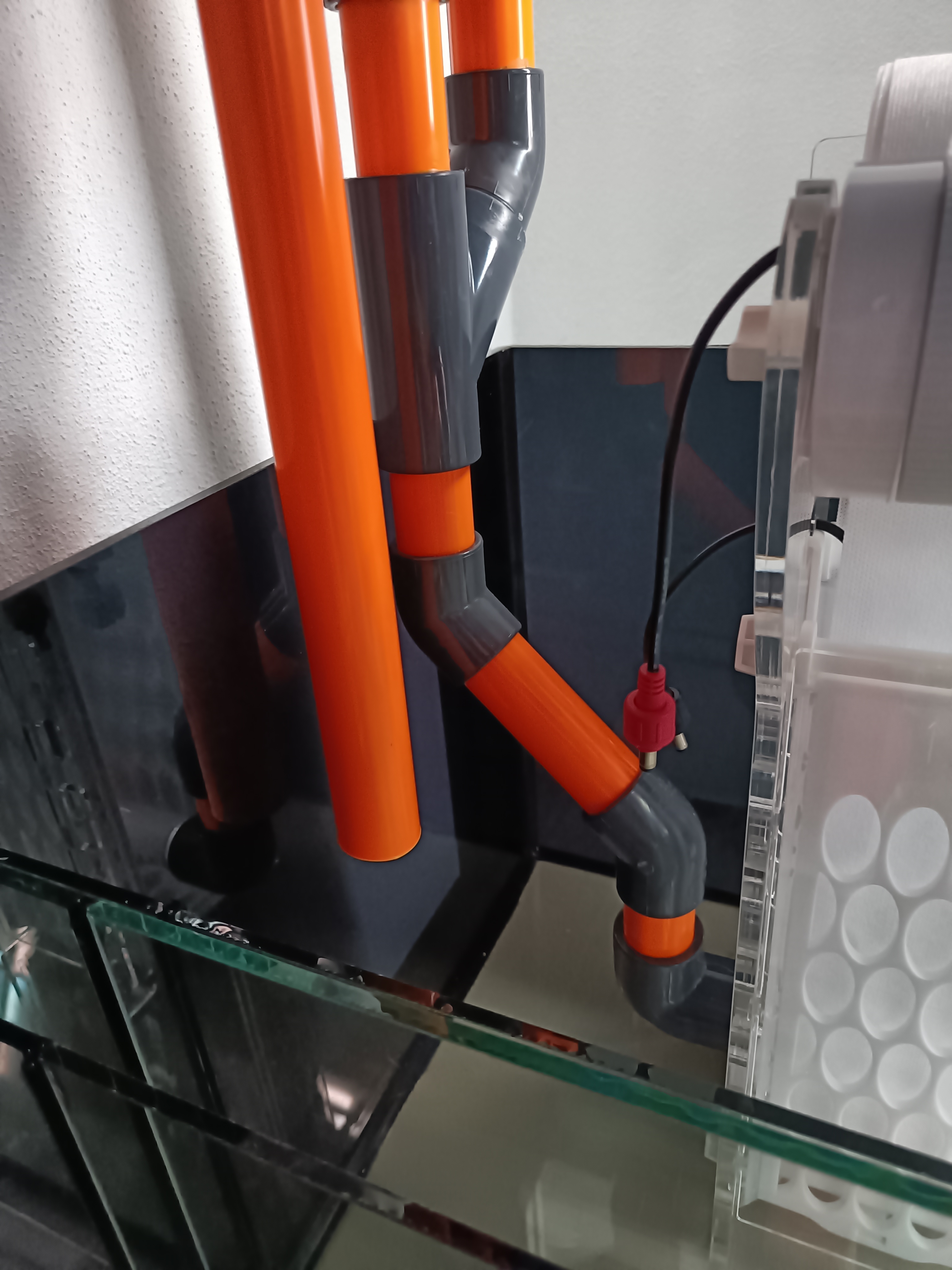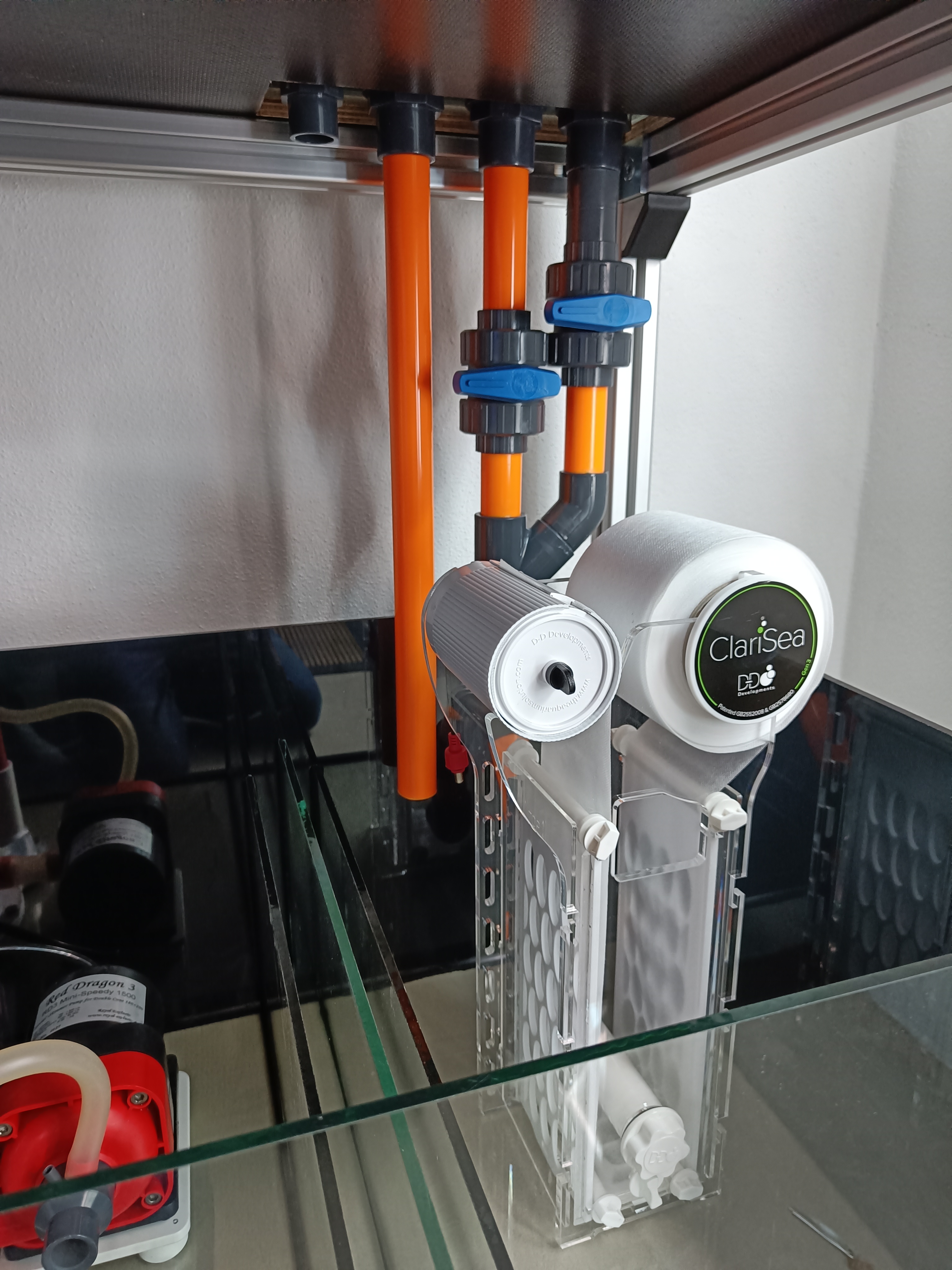 Af tanker i forbindelse med opstart af det hele, har Apex systemet skullet være et bærende element. For at kæle lidt for detaljerne har jeg derfor købt PVC rør i orange. I overløbet er der lavet 4 huller - 1 x 25mm (Retur) 3 x 32mm (Nedløb/durso samt sikkerhed) Jeg skal som sagt bruge et ClariSea rulle filter. Jeg har fået monteret nyt pvc på indløbet til filter. Jeg er gået med 2 haner på nedløb og durso, så alt kan justeres ind, så det er helt lydløst. I og med retur "kun'" er 25mm og nedløb er 32mm har jeg kørt disse to sammen, så alt vand render igennem rullefilter, i håb om at sumpen bliver forholdsvis ren. Jeg har valgt at gå med Royal Exclusive skummer som jo benytter sig af rød PVC rør. Tanken har strejfet mig selv at lave et nyt niveau rør, samt pakke luftindtaget ind i orange folie, bare så farven matcher