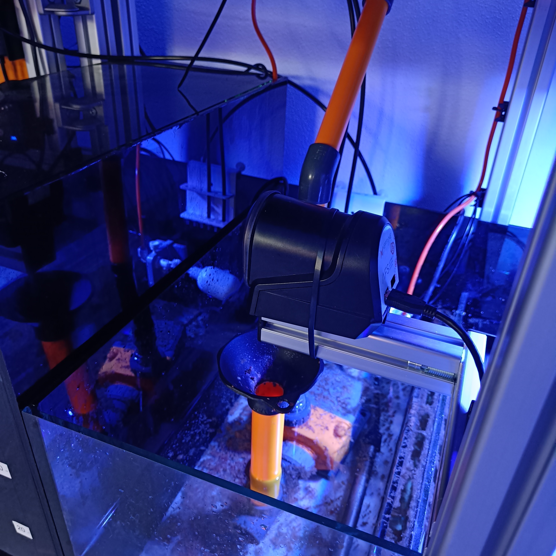 I sumpen har jeg fået monteret endnu en XR15 lampe med en 3d printet lampeskærm. Jeg har på sigt planer om en lille frag tank her, men for nu er det ikke nødvendigt. Når jeg kommer dertil engang bliver der monteret en MP10 eller Nero3 pumpe som cirkulation. Pool cover vil i den forbindelse også blive lagt over de resterende rum, for at forhindre algevækst. Skillevæggene i boblefælderne blev, da sumpen blev lavet monteret med sort baggrund, så heller ikke her vil lyset finde vej til retur og skummer kammer