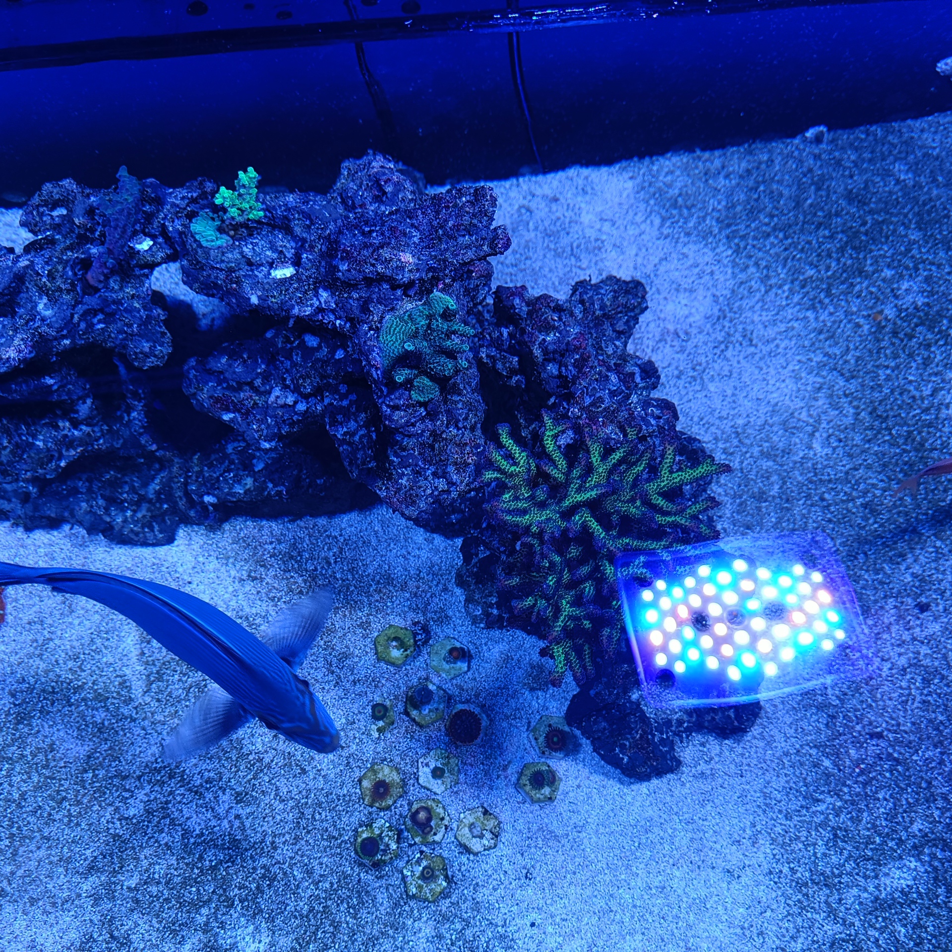Jeg har indtil videre monteret 4 x Radion XR15 G5 Pro lamper. Om det er nok på sigt må tiden vise. Jeg har 2 x Orphek 120 cm, samt 2 x Orphek 60 cm på lager der hurtigt kan monteres såfremt det ikke er nok.